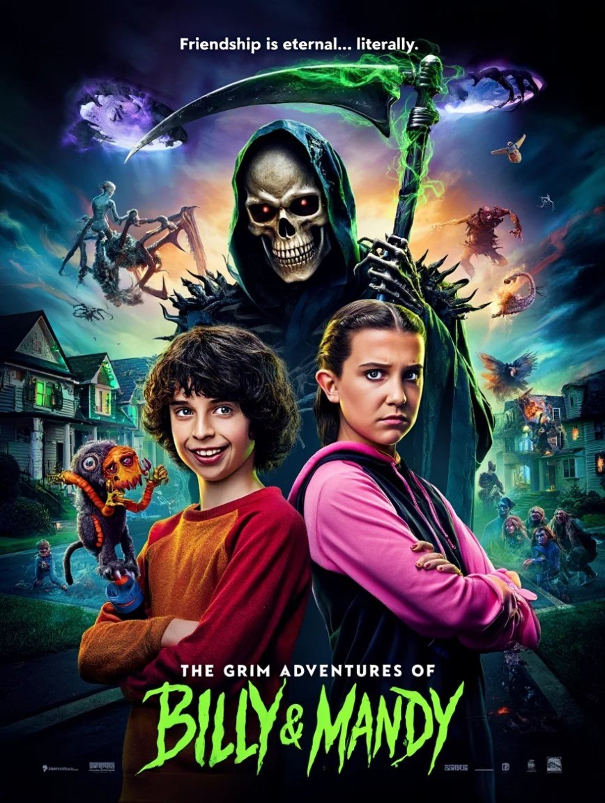 Step into a darkly whimsical world where humor, horror, and heart collide in The Grim Adventures of Billy & Mandy (2025). Nearly two decades after their original misadventures, Billy, the lovable but clueless troublemaker (Finn Wolfhard), and Mandy, the sharp-witted, fearless girl (Millie Bobby Brown), find themselves facing the ultimate supernatural challenge: the Grim Reaper himself, now portrayed by the enigmatic Javier Bardem, returns with a mysterious plan that could tip the balance between life and the afterlife.