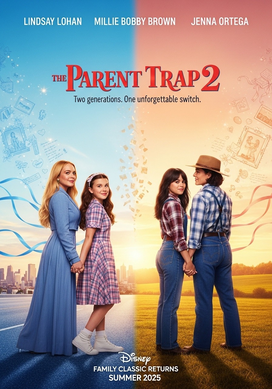THE PARENT TRAP 2 (2025) Starring: Lindsay Lohan • Natasha Richardson (archive appearance) • Millie Bobby Brown • Jenna Ortega