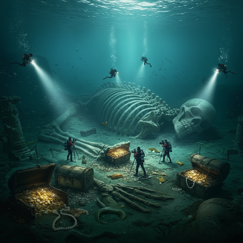 Surrounding the skeleton were dozens of treasure chests, each packed with coins, ornamental jewelry, and relics fashioned from materials unknown to modern metallurgy. The enormous skeletal remains, estimated to stand more than five times taller than an average human, display remarkable preservation despite being buried under layers of coral and sediment for what experts estimate could be tens of thousands of years.