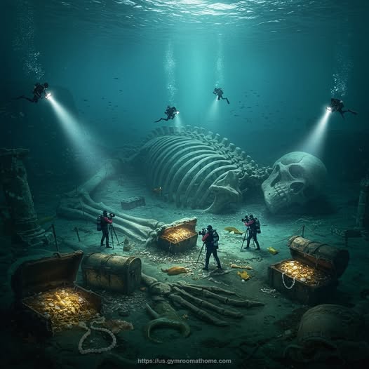 A team of professional deep-sea divers has made what many are calling the most astonishing archaeological discovery of the century — the fully preserved remains of a colossal humanoid skeleton lying among the ruins of an ancient underwater city. The site, located deep within an oceanic trench, appears to have once been a monumental temple complex, complete with massive stone pillars, gold-engraved altars, and wall carvings depicting figures of extraordinary size.