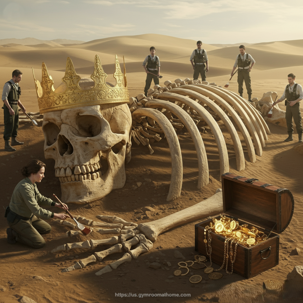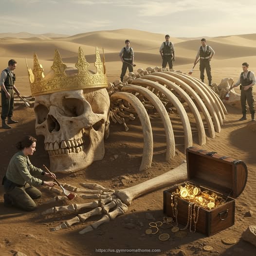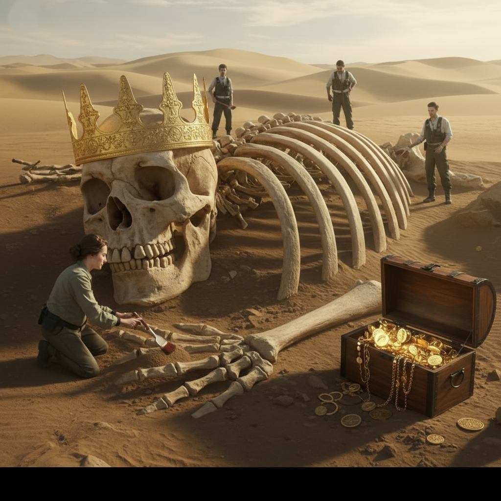 A team of archaeologists working in a remote desert region has unearthed a colossal humanoid skeleton unlike anything seen before — and on its skull rests a golden crown, still gleaming beneath centuries of sand. Measuring over twelve meters in length, the remains appear to belong to a being of extraordinary stature and power. Surrounding the body are fragments of weapons, stone tablets engraved with unknown symbols, and a chest overflowing with artifacts made of gold, lapis lazuli, and obsidian. The burial chamber itself was constructed from massive sandstone blocks, each weighing several tons, arranged with a precision that defies ancient engineering capabilities.