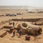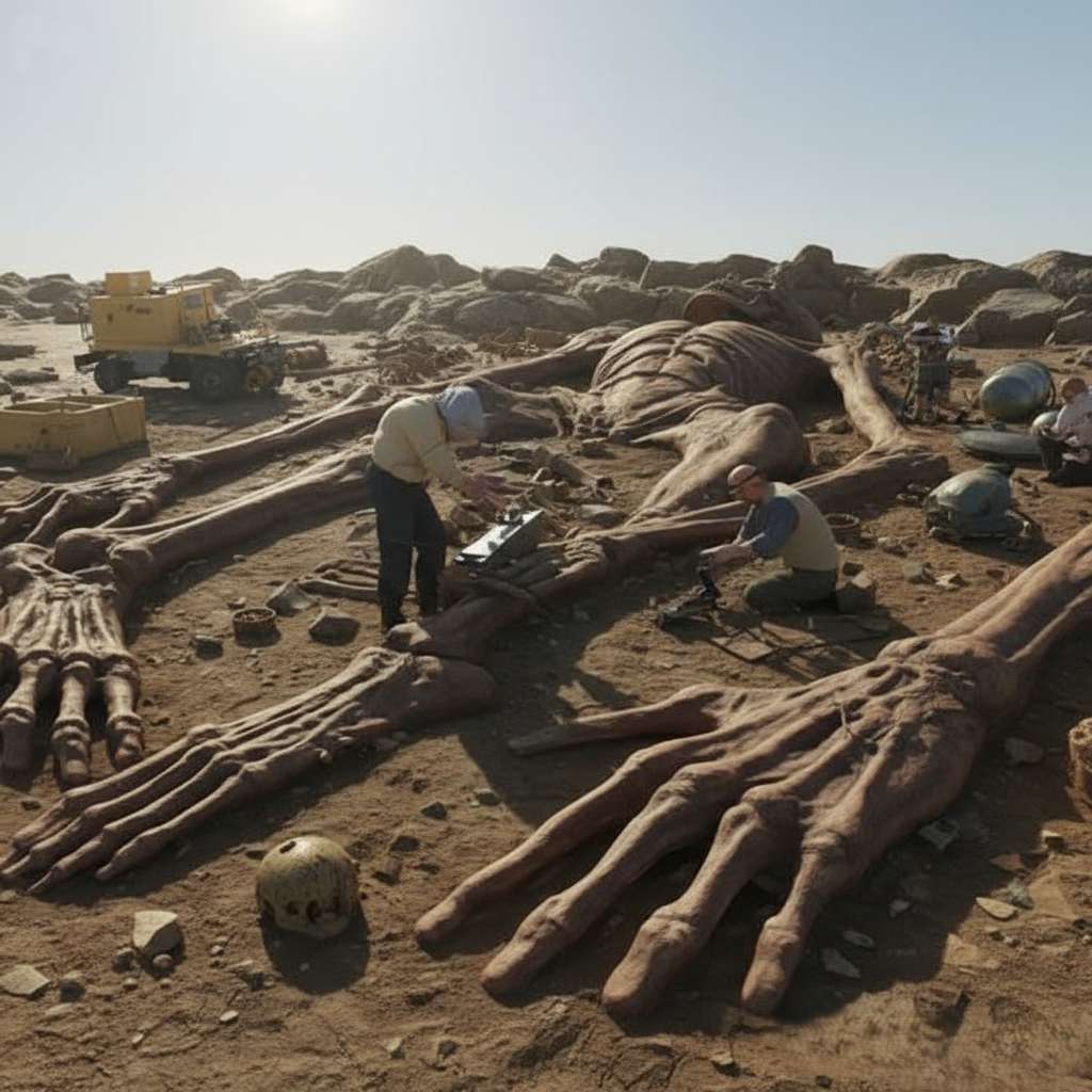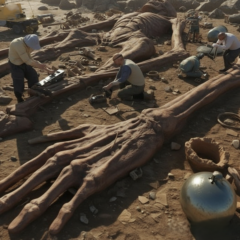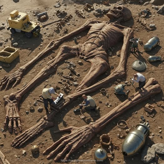 Archaeologists excavating a remote desert plateau have uncovered what may be the most controversial and paradigm-shifting discovery in modern history — the complete skeletal remains of a 25-foot-tall humanoid being buried among a cache of intricately engineered metallic artifacts. The surrounding area, once thought to be an unremarkable geological site, now appears to conceal evidence of a civilization that fused organic life with advanced technology long before the rise of known human societies.