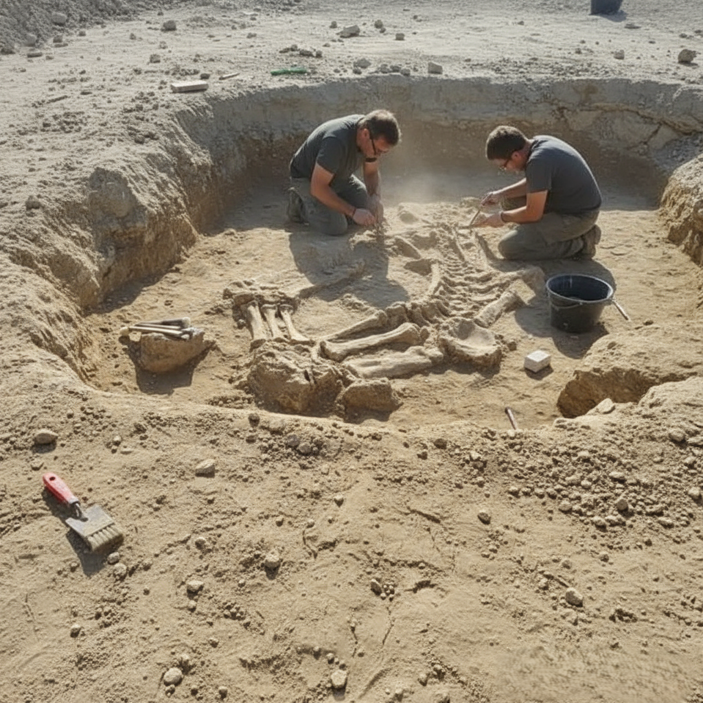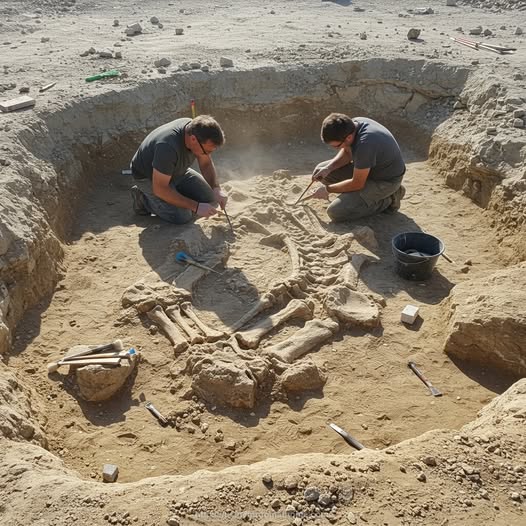 A scientific expedition searching for traces of early human habitation in a remote desert has made an unprecedented discovery — the colossal skeletal remains of what appears to be a humanoid being of impossible proportions. Excavators first uncovered fragments of bone protruding from the sand, assuming them to be remnants of ancient fauna. But as they dug deeper, an enormous rib cage emerged — spanning over six meters across, dwarfing any known species on record. The further the team excavated, the clearer it became that this was no ordinary fossil.