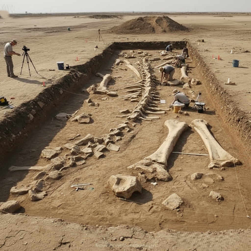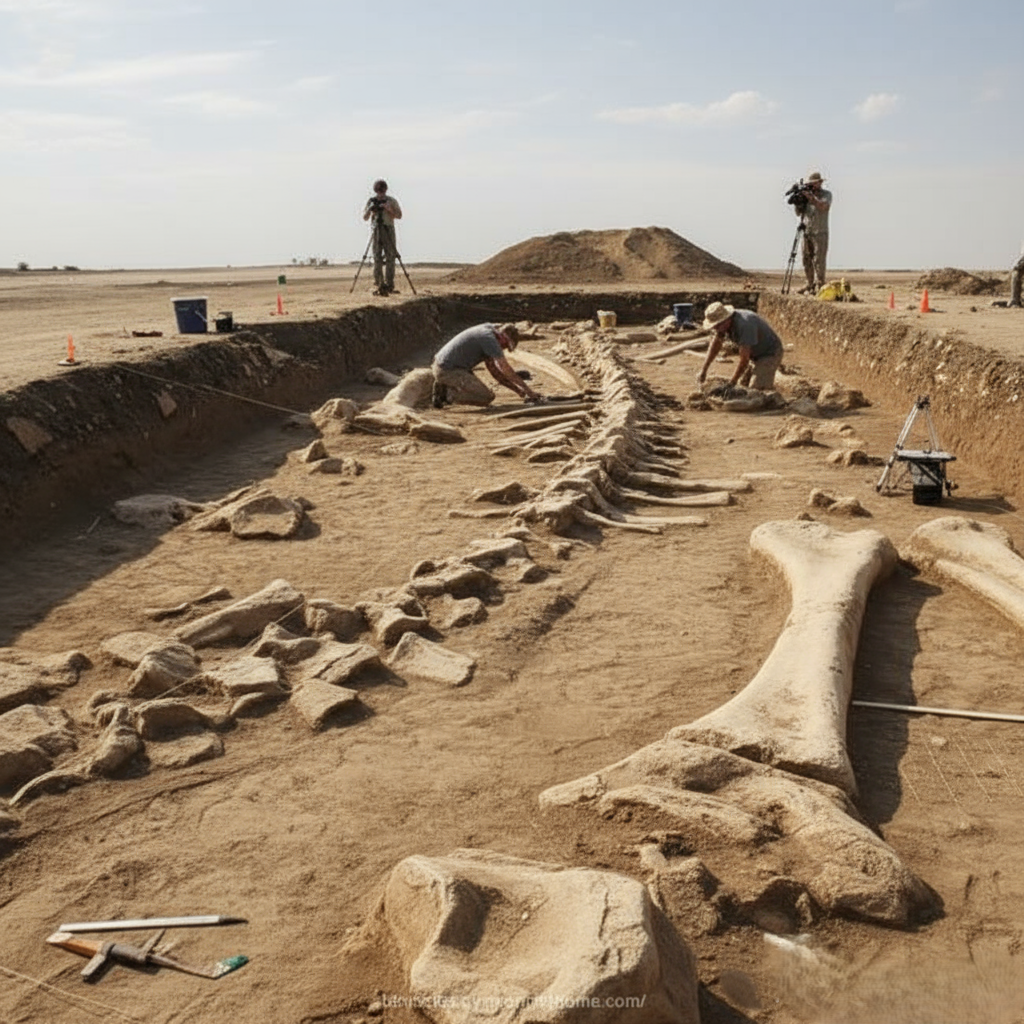 A team of archaeologists operating in one of the most remote stretches of desert has unearthed what may be the most extraordinary find of the century — the skeletal remains of a colossal humanoid buried beneath layers of sand and sediment. The bones, perfectly aligned in anatomical formation, suggest a being that once stood nearly four times taller than the average human. Early geological assessments indicate the remains could be tens of thousands of years old, predating any known civilization in the region.
