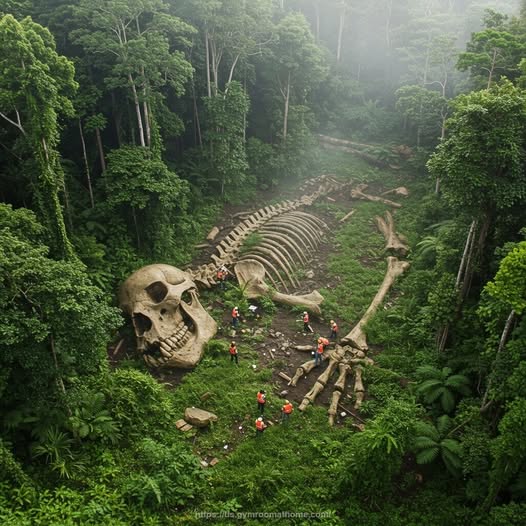 Archaeologists and independent explorers have announced one of the most astonishing findings of the century — a gigantic humanoid skeleton unearthed deep within an isolated tropical rainforest, far from any known settlements or modern infrastructure. The skeletal remains, partially embedded in the dense undergrowth and layers of ancient soil, appear to belong to a being several times the size of an ordinary human. Early measurements suggest the full height could have exceeded fifteen feet, with bone density and structural composition unlike anything previously recorded in the fossil record.