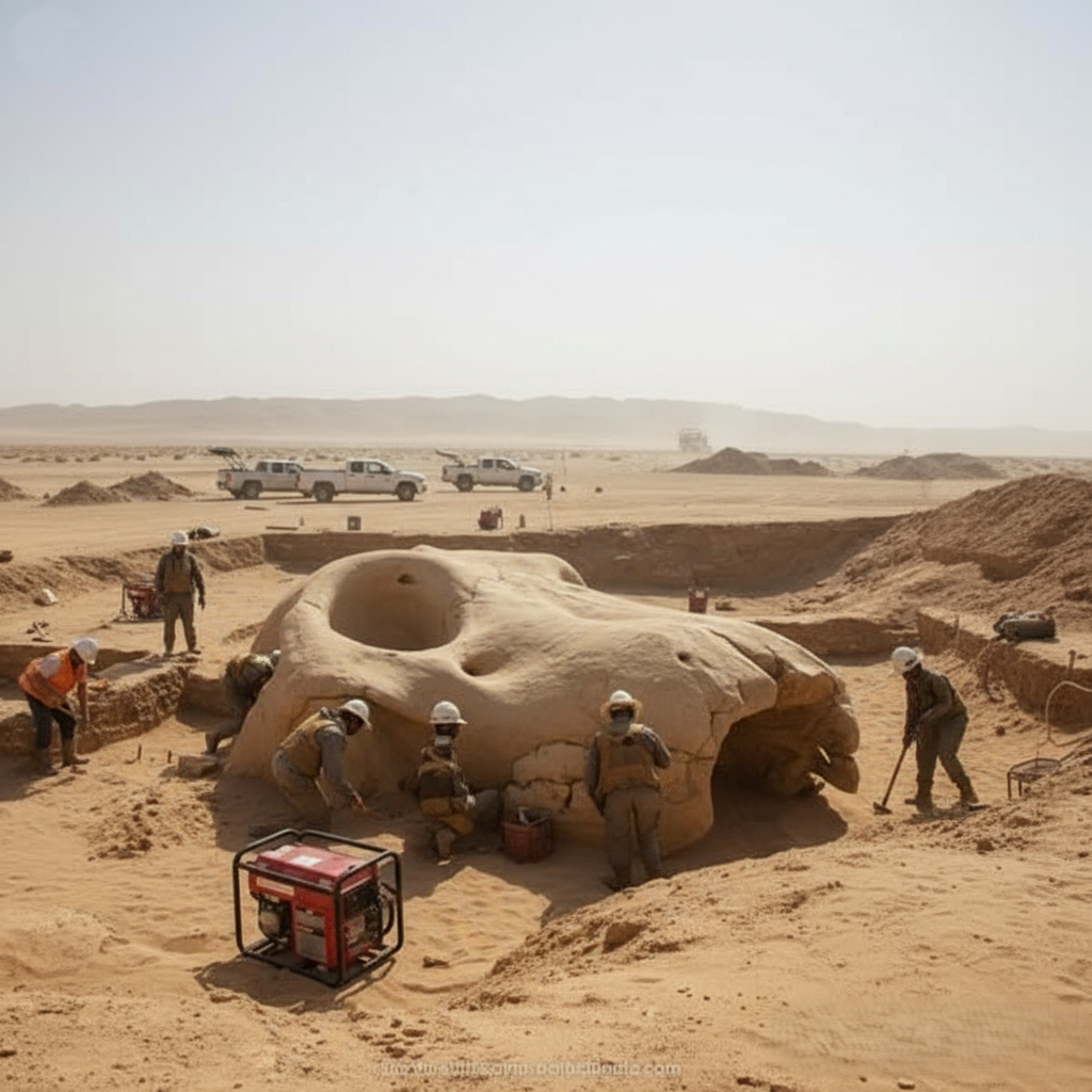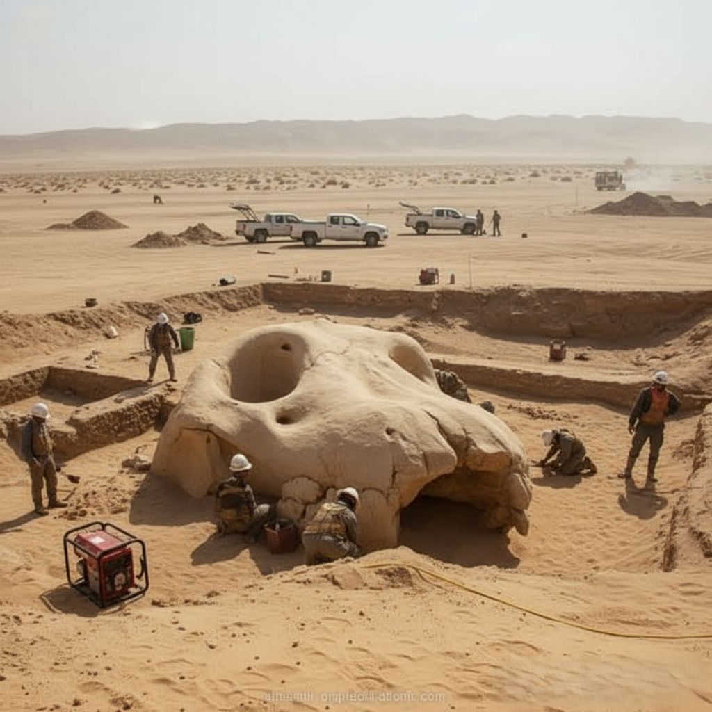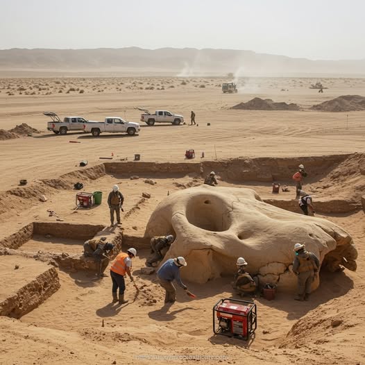 A groundbreaking archaeological find has stunned the scientific world — a massive fossilized skull unearthed deep within a restricted desert region, far from any known burial grounds or human settlements. The skull, measuring nearly four meters in length, displays anatomical proportions that cannot be linked to any known human ancestor or animal species. Its cranial cavity suggests an extraordinary brain volume, while the jawbone, with teeth larger than a man’s hand, hints at a being of tremendous strength and intelligence.