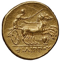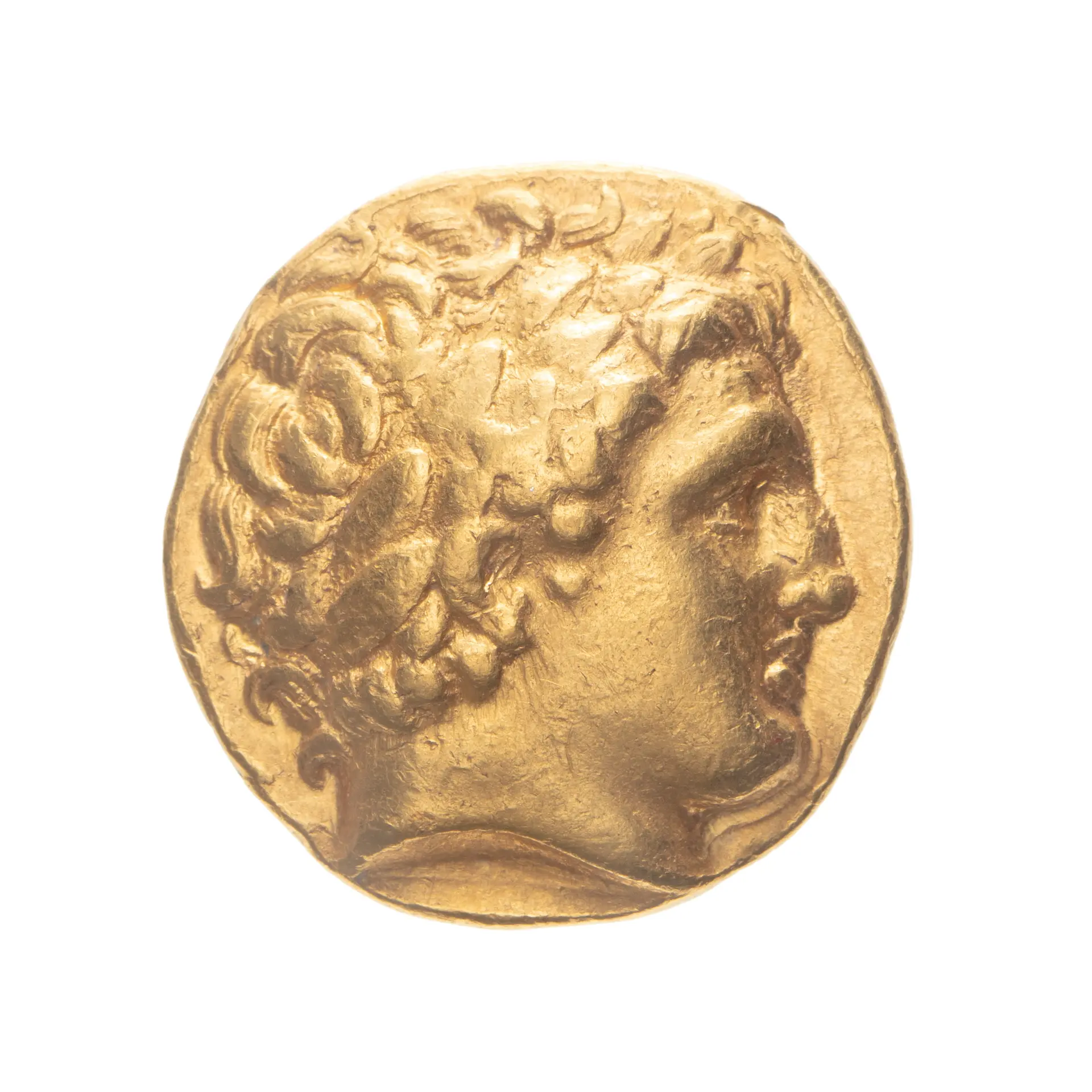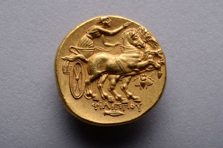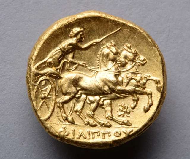 Yet during his lifetime, Philip had other achievements of which he was equally proud—among them, his victories at the Olympic Games. In 352 BC, he won the tethrippon, the four-horse chariot race, followed by another triumph in 348 BC in the synoris, the two-horse chariot race. Earlier, in 356 BC, he had also taken first place in the horse race. These prestigious victories inspired Philip to issue coins celebrating his success, and this gold stater depicts the two-horse chariot from his synoris victory of 348 BC.