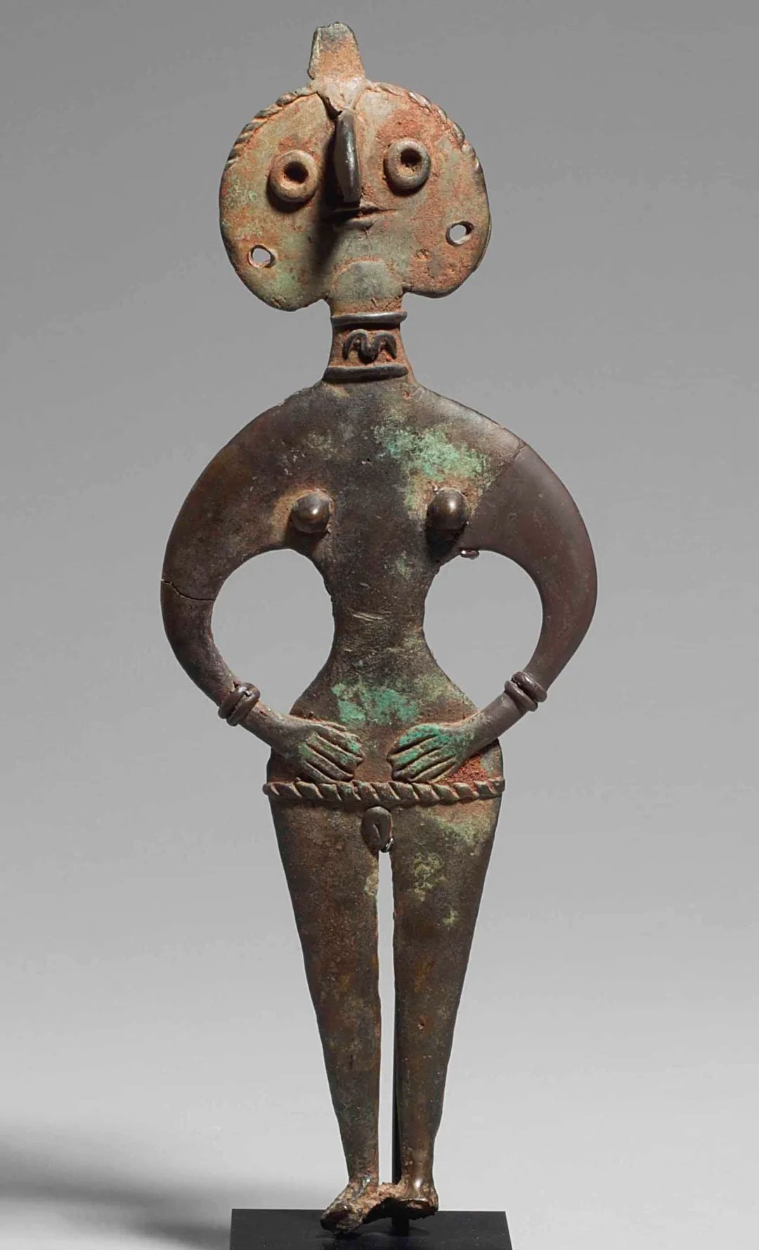 This Bronze Figurine of a Goddess from Syria, dating to around 1950–1750 BCE, is a remarkable example of early Near Eastern bronze craftsmanship.