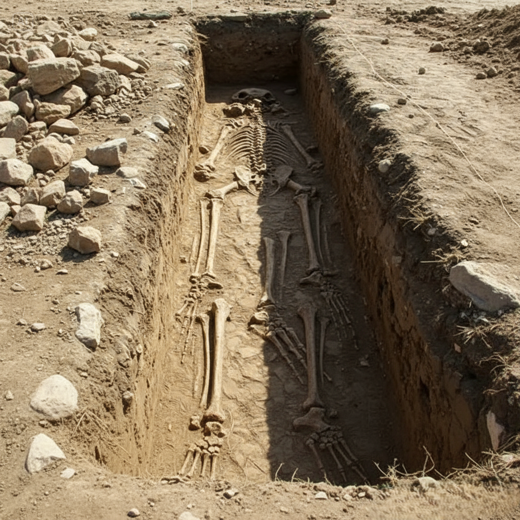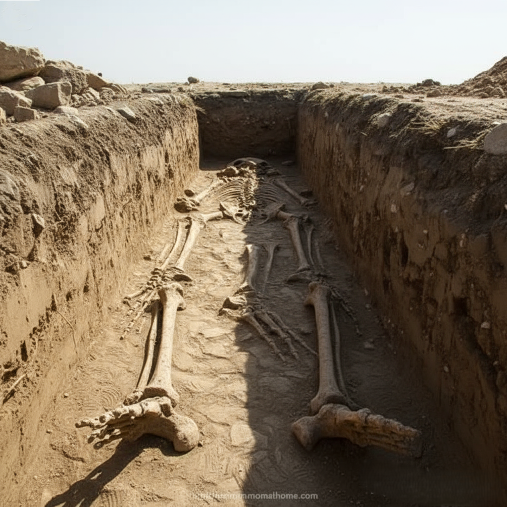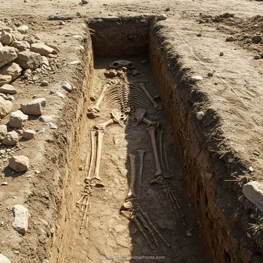 A team of archaeologists has unearthed a discovery that could rewrite the story of human history — a massive humanoid skeleton, sealed within an ancient stone-lined trench and preserved in extraordinary condition. The remains, several times larger than an average human, display perfect skeletal symmetry yet proportions that seem impossible by any known biological standard. Excavation photos leaked from the site show massive femurs, elongated rib structures, and skull dimensions that challenge every known classification of human evolution.