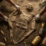 According to preliminary geological assessments, the burial predates recorded civilization, with soil strata indicating a timeline that may stretch back tens of thousands of years. There is no evidence of tampering or artificial placement — suggesting this was a genuine interment, carried out with ritual precision. The body’s position and the faint traces of ochre pigment nearby hint at a ceremonial burial, perhaps belonging to an ancient culture that revered beings of enormous size and strength.