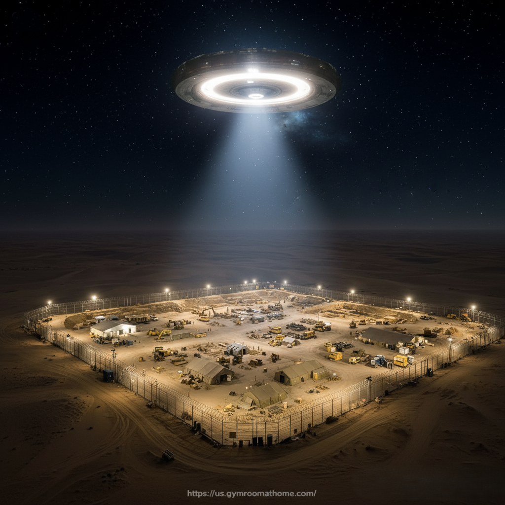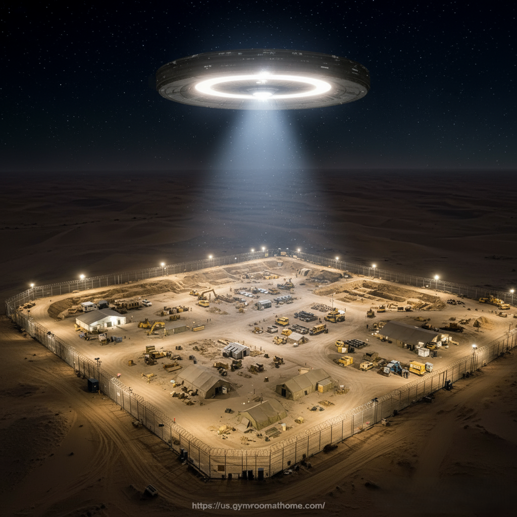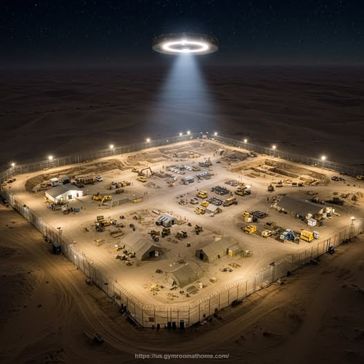 A remote military compound hidden deep in the desert has become the epicenter of worldwide chaos and speculation after leaked footage revealed a massive unidentified flying object silently descending over the site. The craft — described as a dark, metallic disc emitting a pulsating blue light — hovered for several minutes directly above an area rumored to house classified excavation projects involving “non-human biological entities.”