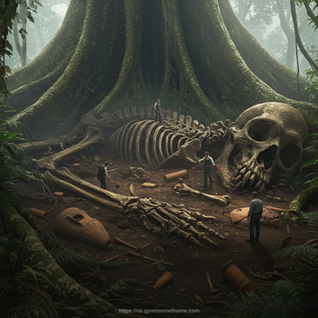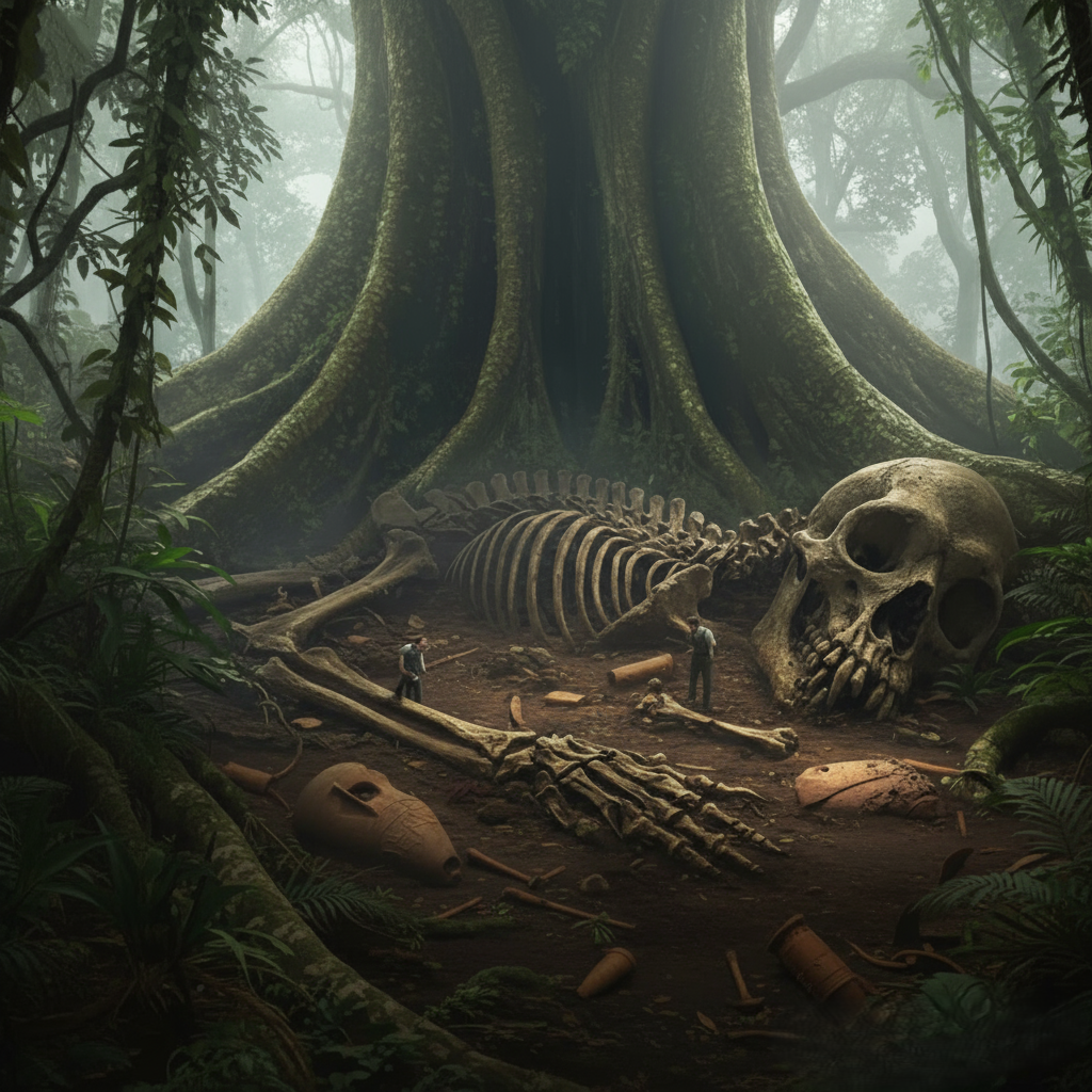 Archaeologists deep in the rainforest have uncovered what could be the largest human-like skeleton ever discovered, resting beneath the tangled roots of a colossal ancient tree. The skull alone is said to measure several meters in length, its hollow eyes fixed toward the canopy above — as if guarding the forest that grew from its grave.