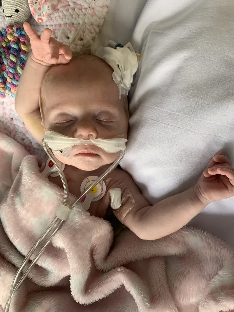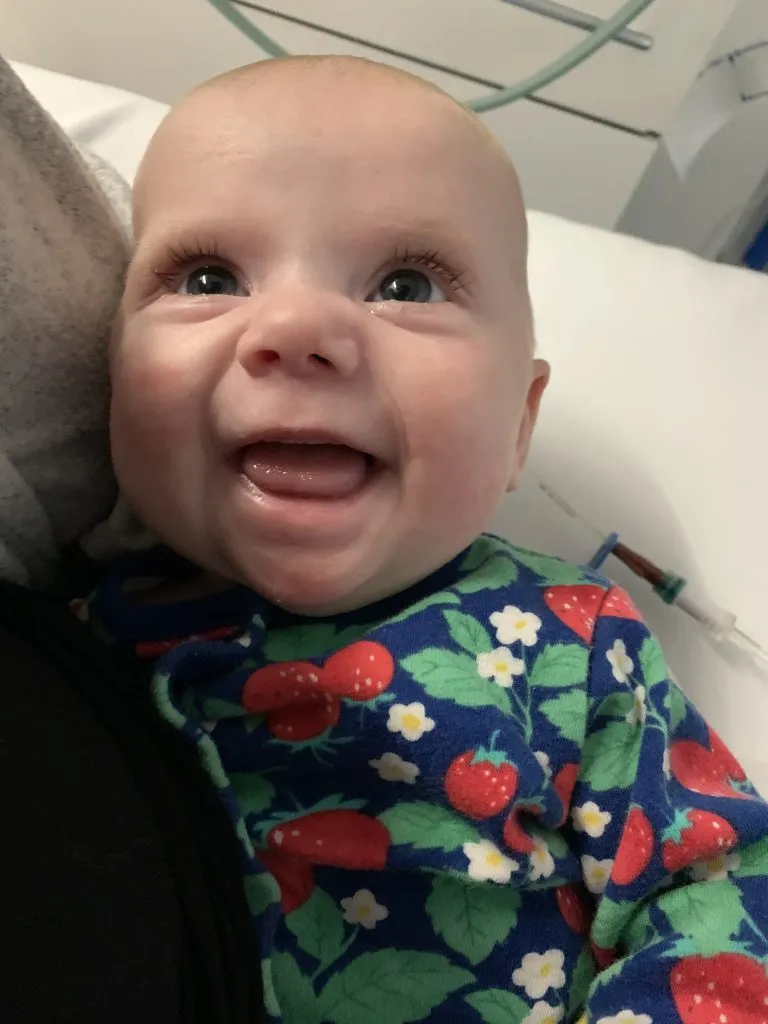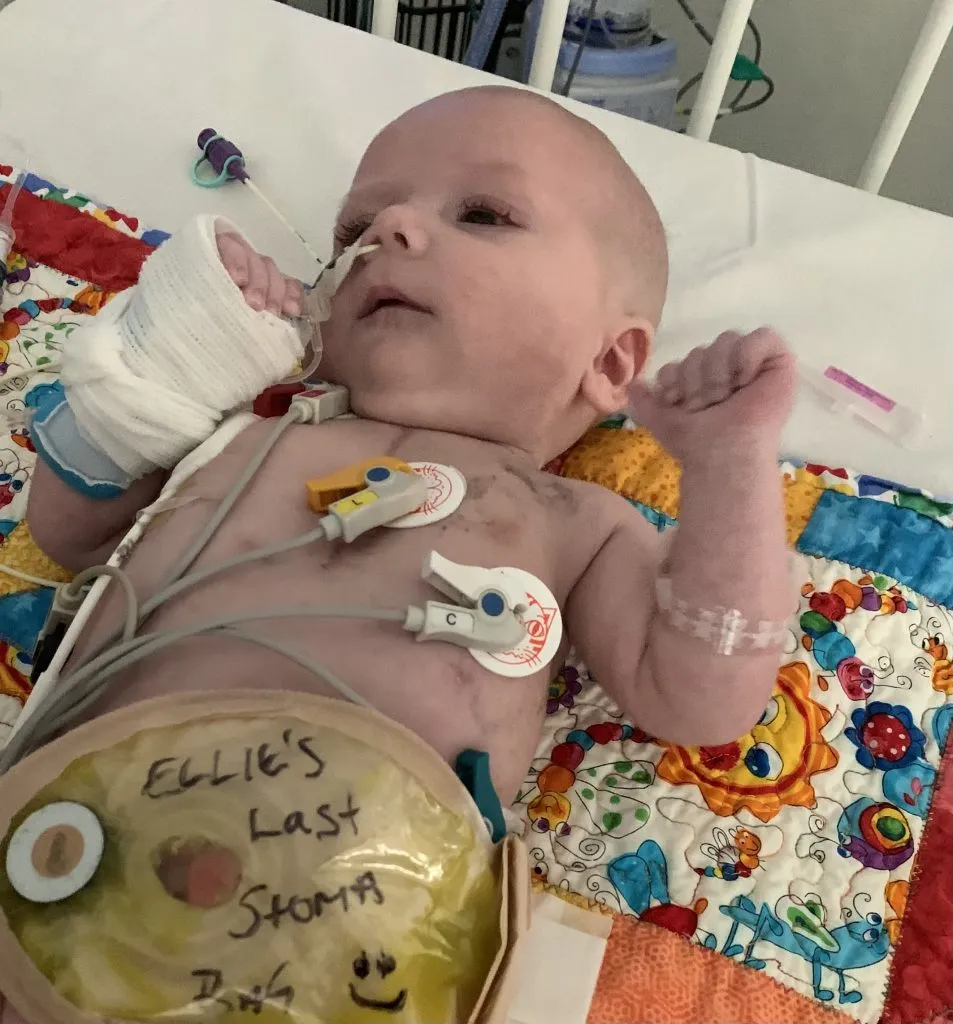 Feeding Ellie proved to be another challenge. Due to her stoma output, she struggled to gain weight. She stayed on TPN for three more weeks until the surgeons could perform stoma closure. Just before the procedure, Ellie developed a rapid heart rate and rigors — shivering fits indicating infection. Tests revealed a Hickman line infection, and she was placed on targeted antibiotics.