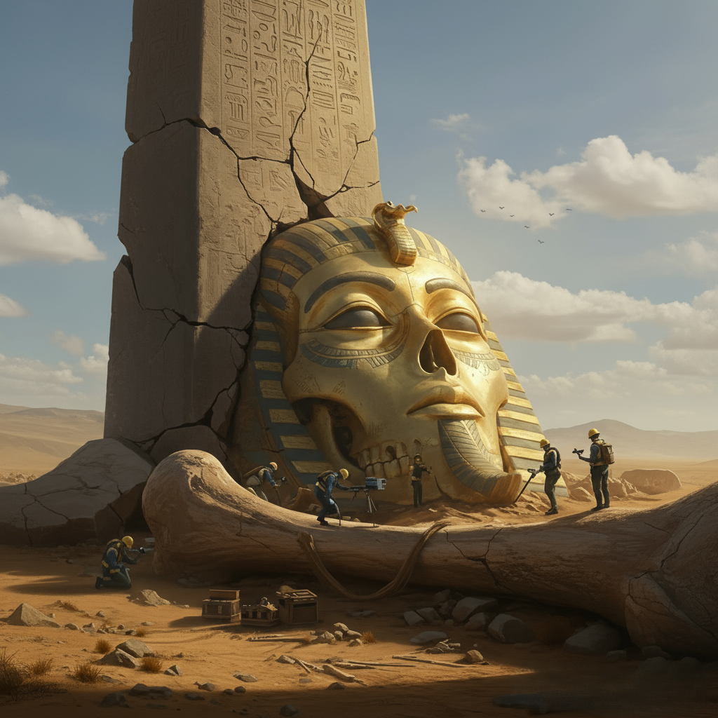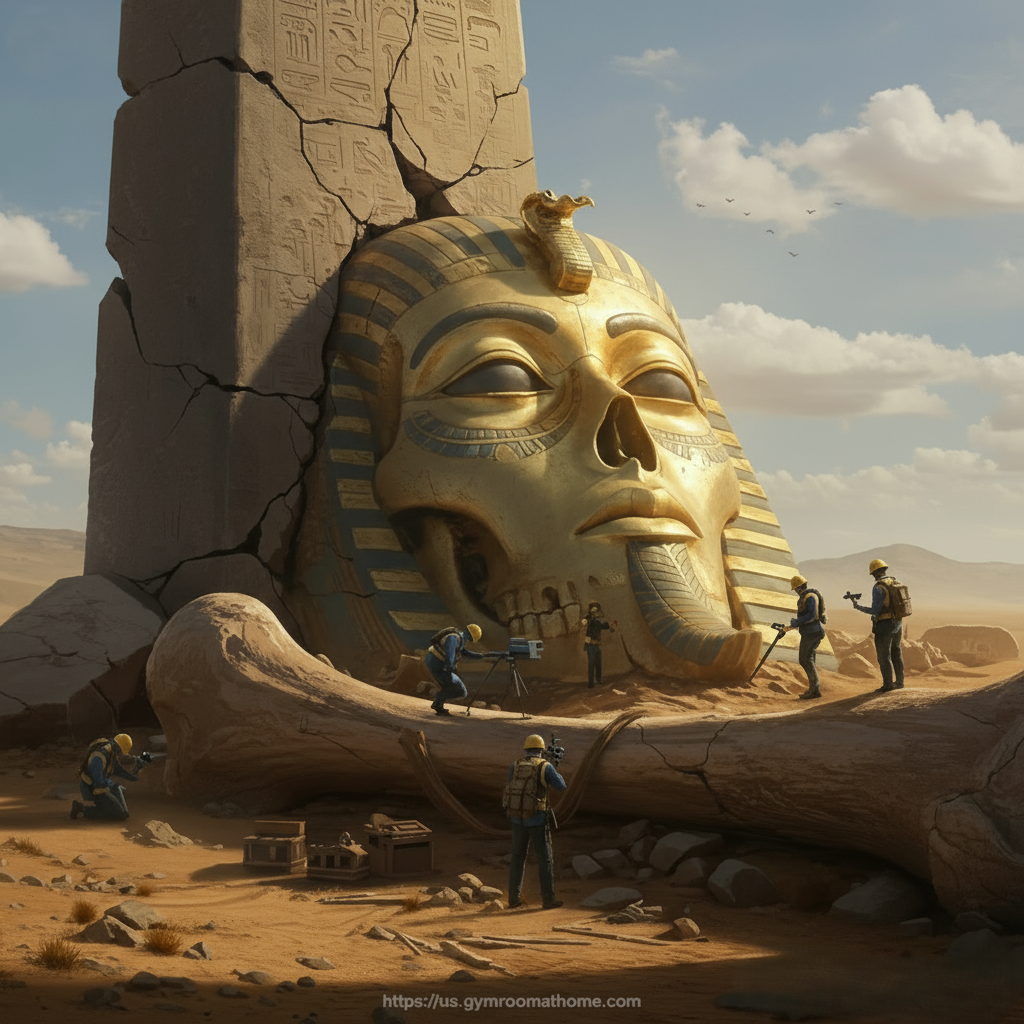 A stunning archaeological revelation has emerged from the shifting sands of Egypt — the colossal remains of a pharaoh-like figure, discovered deep within an isolated desert excavation. Measuring far beyond the scale of any known human skeleton, the remains include fragments of a massive ribcage, elongated limbs, and what appears to be a solid gold funerary mask intricately engraved with hieroglyphs never before seen in recorded Egyptian history. The site, partially enclosed by the remnants of a shattered obelisk, bears markings that suggest a forgotten dynasty — perhaps one predating all known pharaonic lineages.