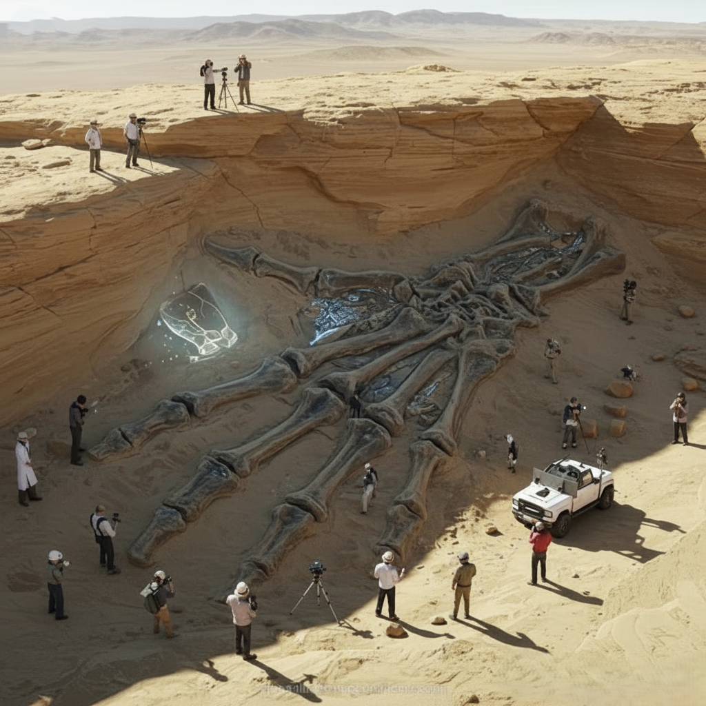 A team of archaeologists conducting a classified dig in an undisclosed desert region has made a discovery that could defy everything we know about evolution and ancient history: a colossal fossilized hand unlike any biological structure known to science. Early reports from inside the excavation camp describe bones stretching several meters in length, each joint and phalange exhibiting precise anatomical articulation—yet bearing proportions no human, primate, or terrestrial creature could possibly possess.