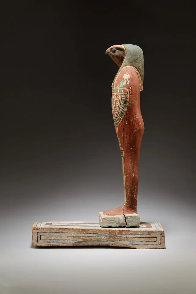 In ancient Egyptian belief, each of these divine sons safeguarded a specific internal organ of the deceased, ensuring protection and renewal in the afterlife. Qebehsenouf, often shown as a ๐ฎ๐ถ๐ฎ๐ฎ๐ช๐ง๐ฐ๐ณ๐ฎ figure, is here depicted in stucco and painted wood, a combination that preserves both color and texture.