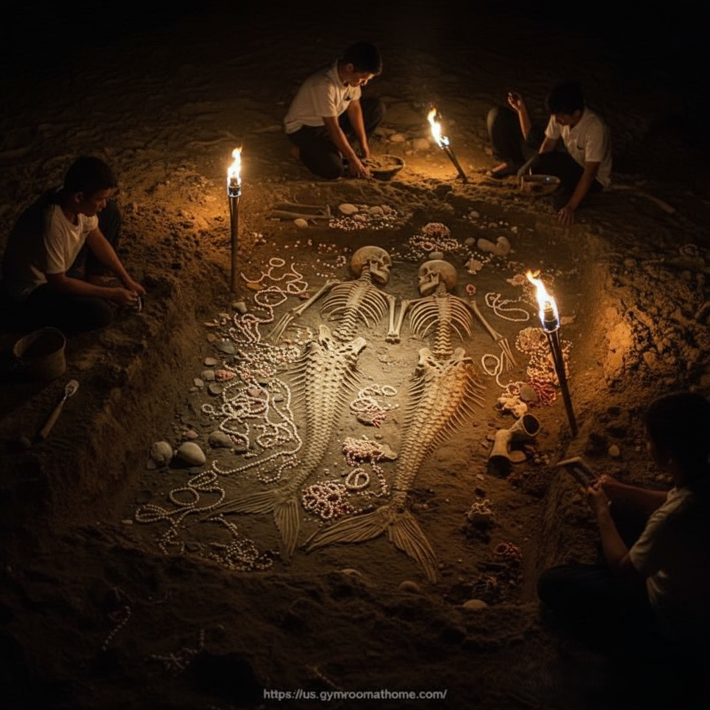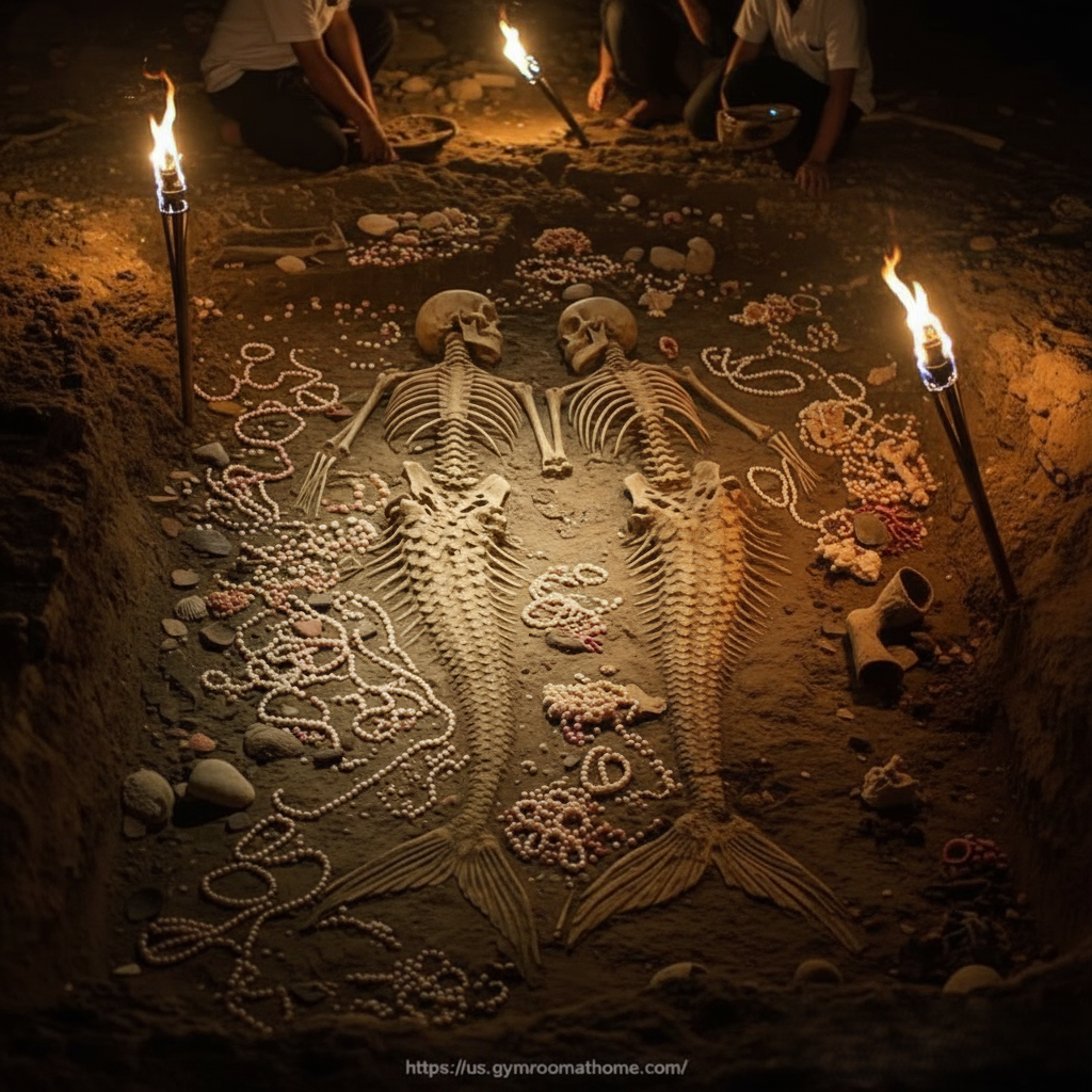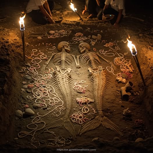 An archaeological team exploring a recently opened limestone chamber beneath an ancient coastal plateau has revealed a discovery that could redefine human prehistory — two perfectly preserved mermaid-like skeletons, positioned side by side in what appears to be a deliberate ceremonial burial. The skeletal pair, measuring approximately 2.3 and 2.6 meters in length, are surrounded by thousands of pearls, carved coral artifacts, and amphora fragments arranged in a precise, symmetrical pattern, suggesting an intentional ritual design.