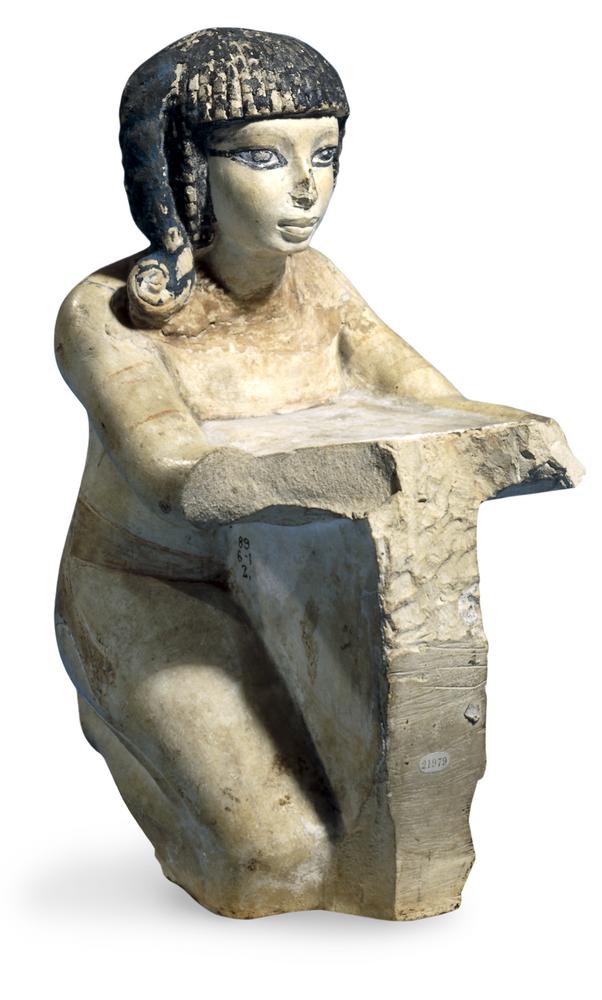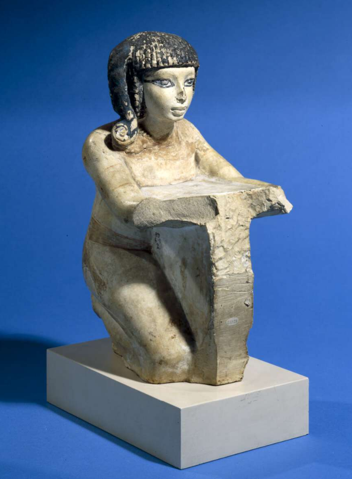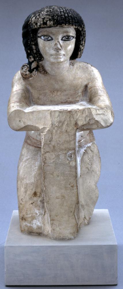 The limestone statue portrays a kneeling priest who once held an offering table. He wears a short, layered wig with a side lock of youth on the right side of his head, a hairstyle traditionally associated with royal children and young princes, but also symbolic of priestly roles, especially those connected to the god Ptah.