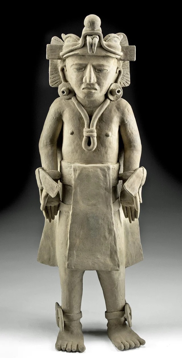 This sculpture exemplifies the artistry of the Veracruz culture, known for their expressive terracotta figures and deep spiritual symbolism, capturing both religious devotion and social hierarchy in pre-Columbian Mexico.