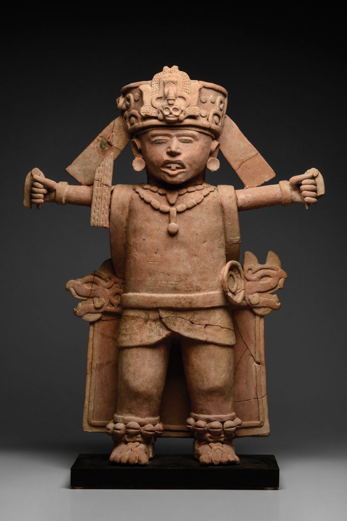 This terracotta statue of a priest wearing a jaguar headdress comes from Veracruz, Mexico, and dates to around 600–900 AD, during the Classic period of Mesoamerican history.
