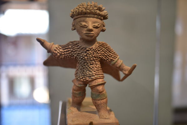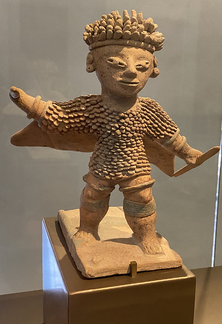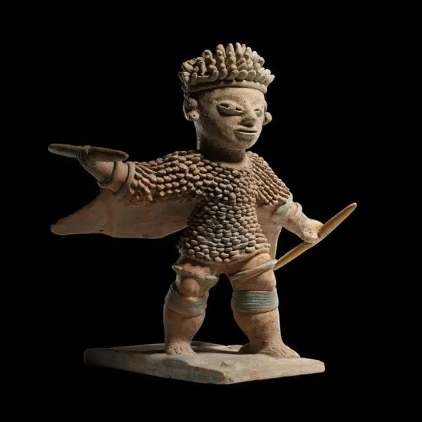 This terracotta figurine depicts a shaman engaged in battle, armed with magical arrows, and originates from the Jama-Coaque culture of coastal Ecuador.