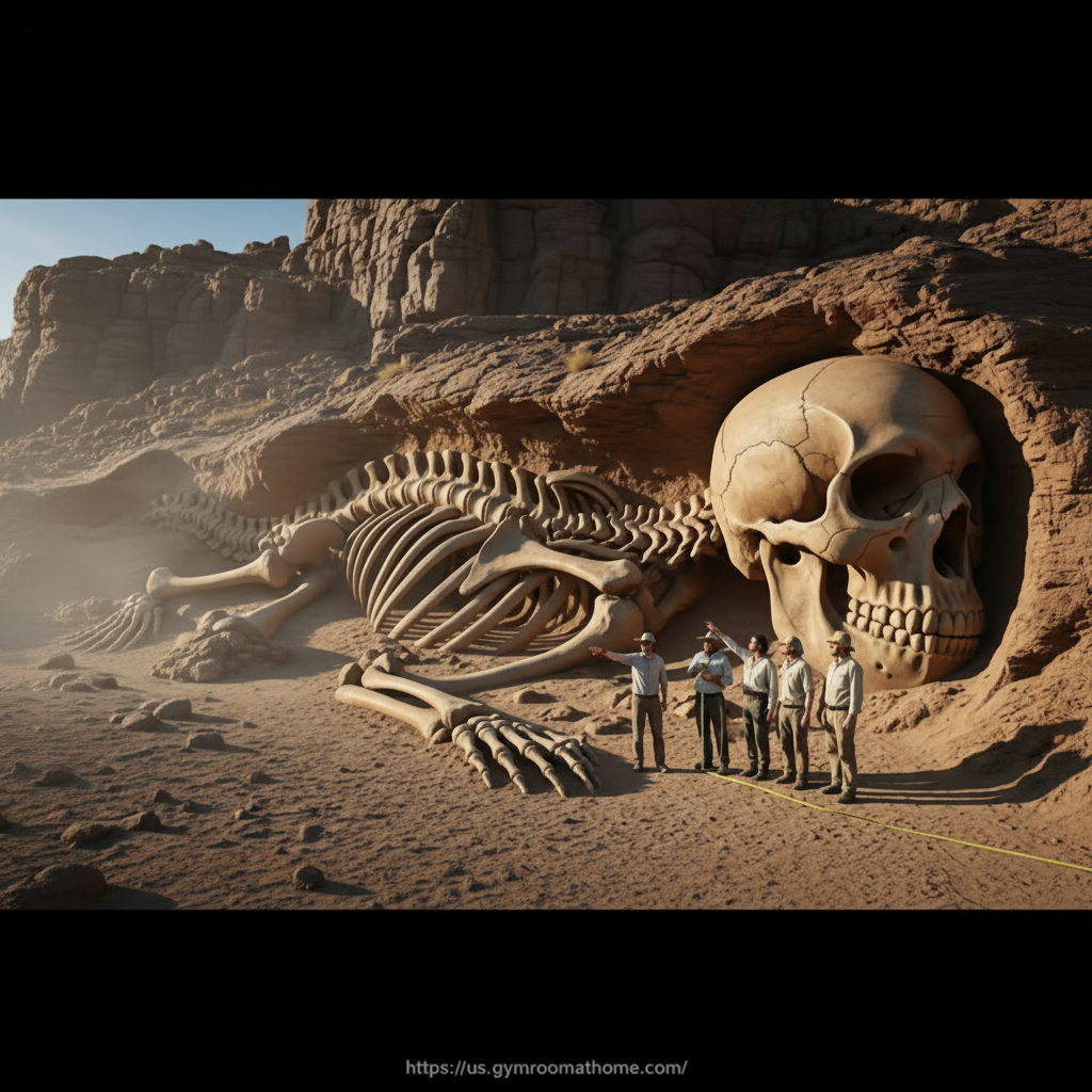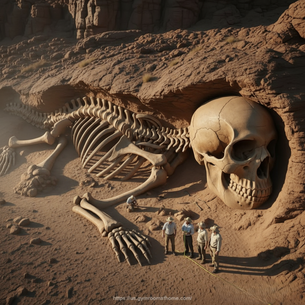 Deep within a remote desert canyon, archaeologists have unearthed what appears to be a colossal humanoid skeleton embedded in ancient rock strata — a discovery that is rapidly becoming one of the most debated finds of the century. Measuring an estimated 40 feet in height, the remains display strikingly human features: a ribcage proportionate to a man’s, elongated femurs, and a skull of extraordinary size. Experts are struggling to classify the specimen, as its scale and preservation defy every known model of human evolution and fossilization.