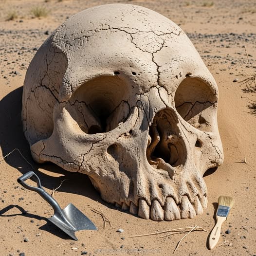 In a desolate stretch of desert long thought to hold nothing but shifting dunes, archaeologists have made a discovery that could upend the foundations of anthropology and human history: the remains of an enormous human-like skull, nearly three times the size of any known specimen. Unearthed at a depth suggesting extreme antiquity, the fossilized cranium exhibits bone density and mineral composition consistent with prehistoric remains — yet its structure is unmistakably human.