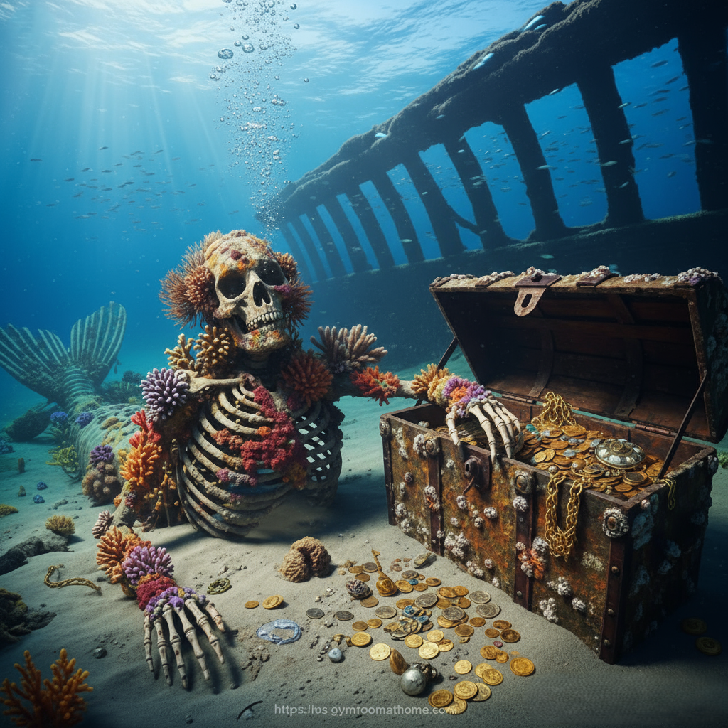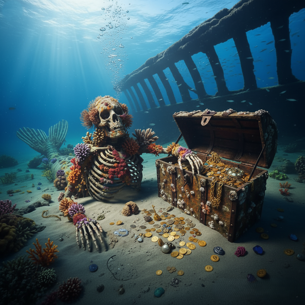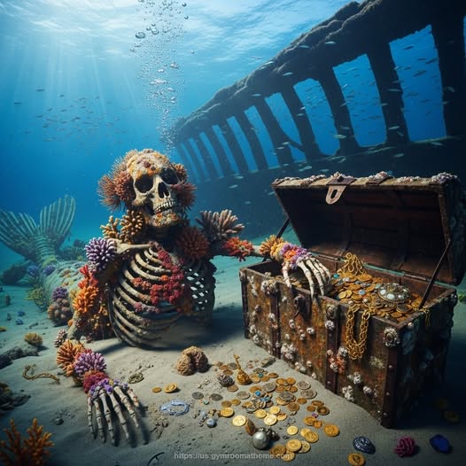 A team of deep-sea divers has reportedly uncovered what could be one of the most mysterious underwater discoveries of the century — a skeletal mermaid-like figure encrusted with coral and marine life, seemingly frozen in time while clutching a chest overflowing with gold, gems, and ancient artifacts.