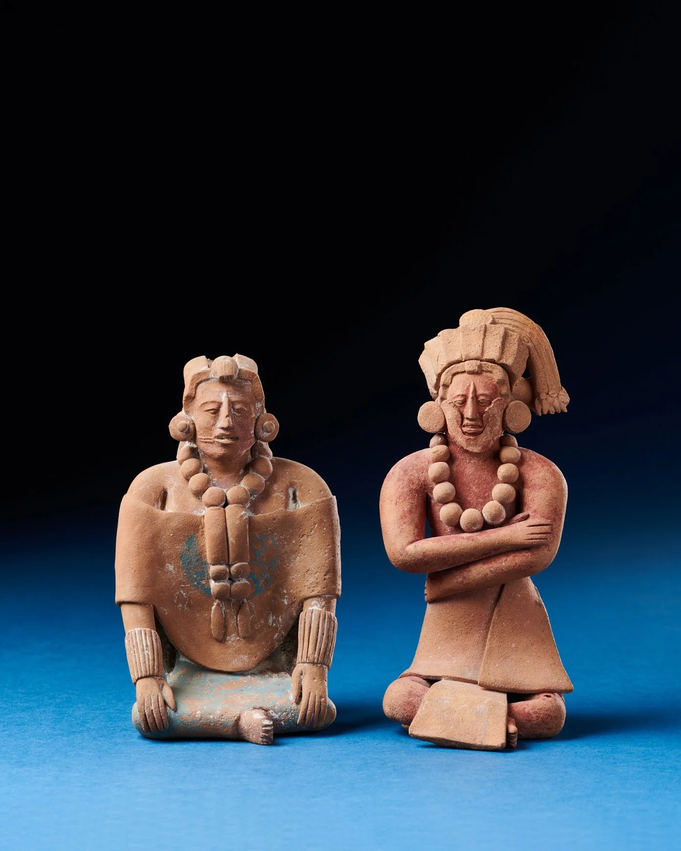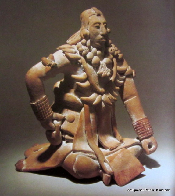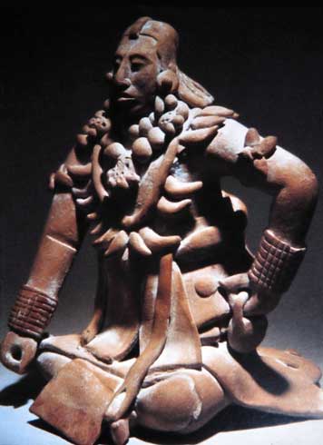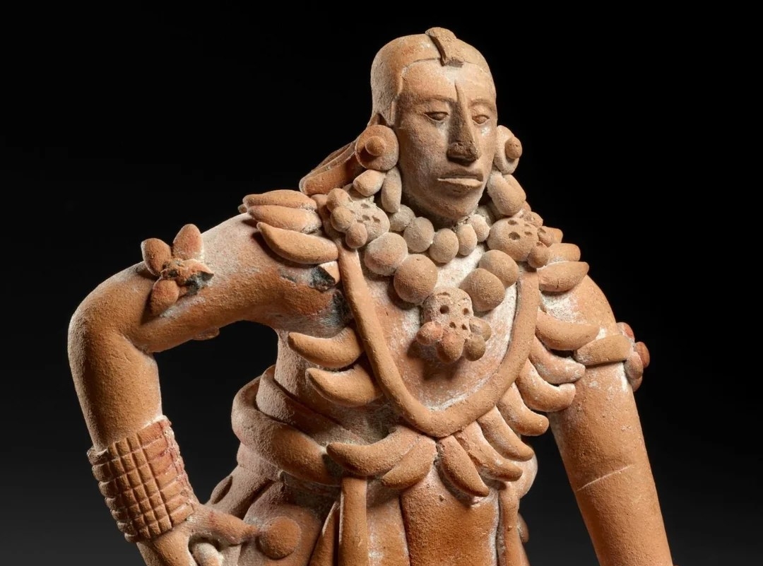 This terracotta sculpture of a seated ball player, created by the Maya civilization in Mexico between 600 and 900 AD, captures the prestige and ritual importance of the Mesoamerican ballgame.