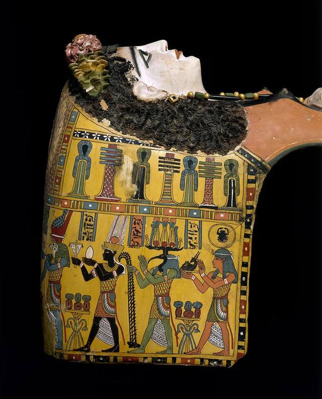 The back of her head is shown resting on a decorated support. Over the top of her head is a gilded wreath encircling a scarab beetle, symbolizing the sun rising at dawnโa metaphor for rebirth. The surrounding areas are filled with an intricate patterned background.