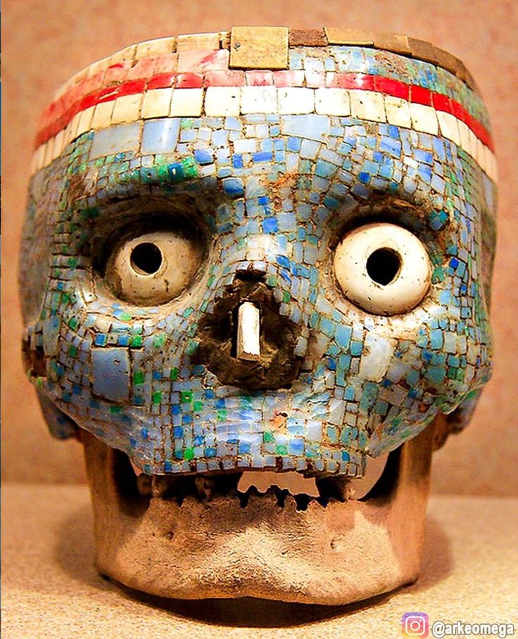 This remarkable artifact is an inlaid human skull from the Aztec (Mexica) civilization, dating to approximately 1300β1521 AD. Now housed in the National Museum of Anthropology in Mexico City, it is one of the most striking examples of Aztec craftsmanship and ritual art.