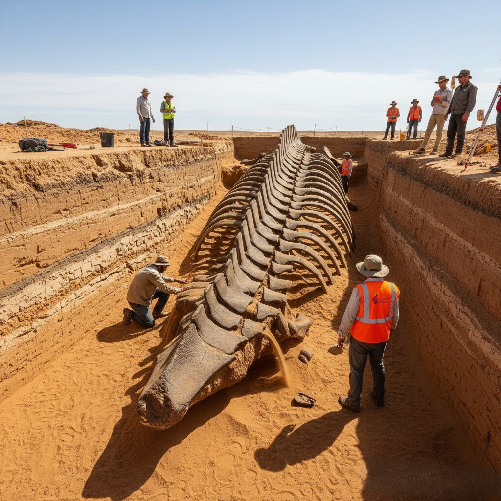 Stretching across the exposed sand is a series of enormous, curved, rib-like formations. Their scale dwarfs the workers standing beside them. Their symmetry is too precise to dismiss as coincidence. And their arrangement suggests a body plan unlike any creature known to science.