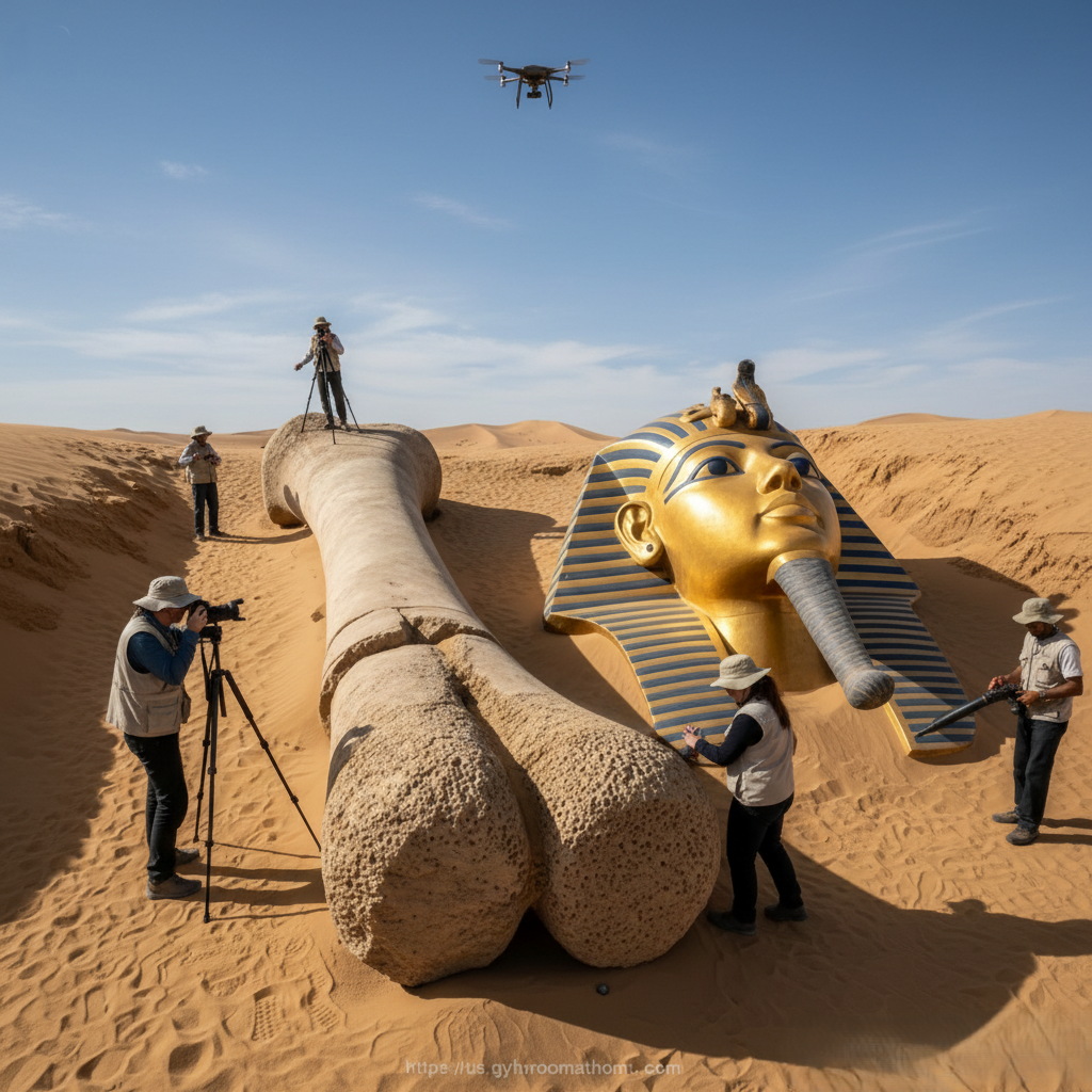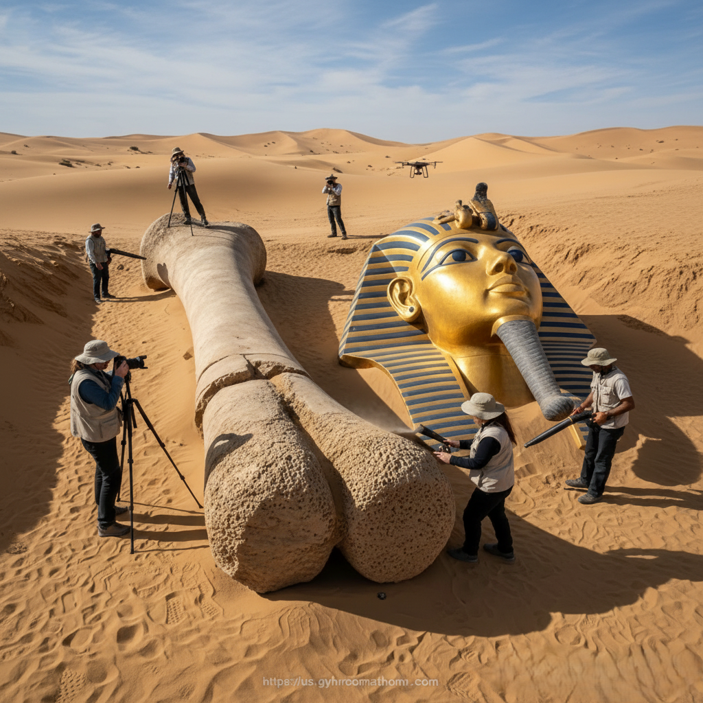 An archaeological team conducting a routine survey in the desert has uncovered a discovery that is already being described as one of the most bewildering finds in recent memory: a colossal pharaoh’s head resting beside an enormous humanlike femur. The scale and proximity of the two objects have ignited intense debate across scientific, historical, and cultural communities.