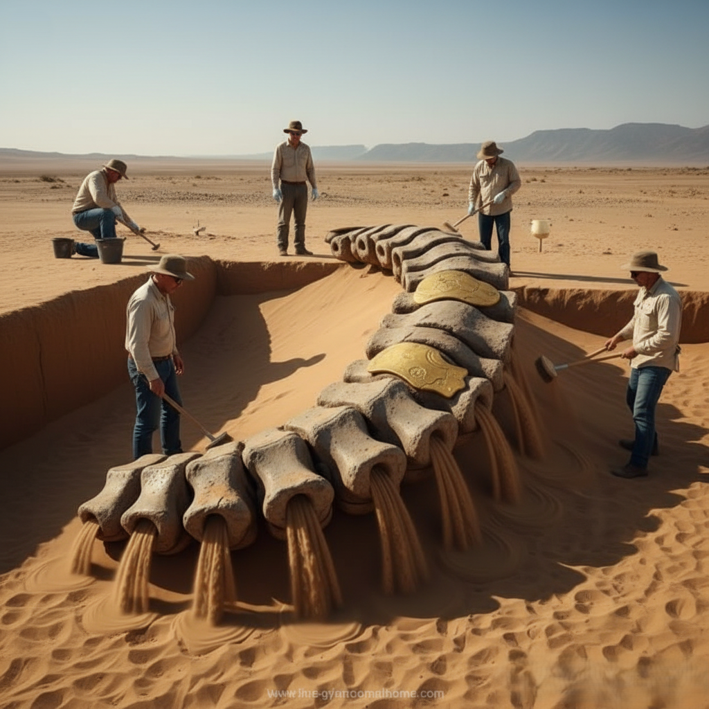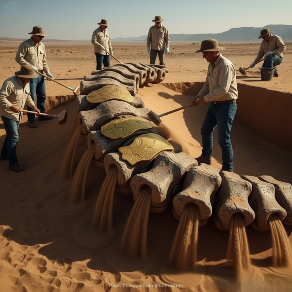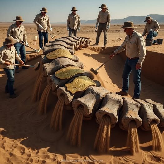 The pharaoh’s head, crafted with unmistakable royal detail and gilded features, was found partially buried as though deliberately placed and concealed. Its craftsmanship aligns with ancient Egyptian aesthetics, yet its size exceeds that of any known ceremonial statue. Even more perplexing is the gigantic bone beside it—so large that it does not align with any recognized species or human variation recorded in archaeology or anthropology.