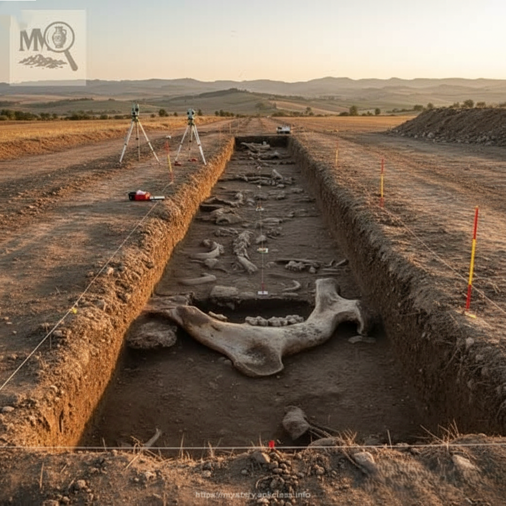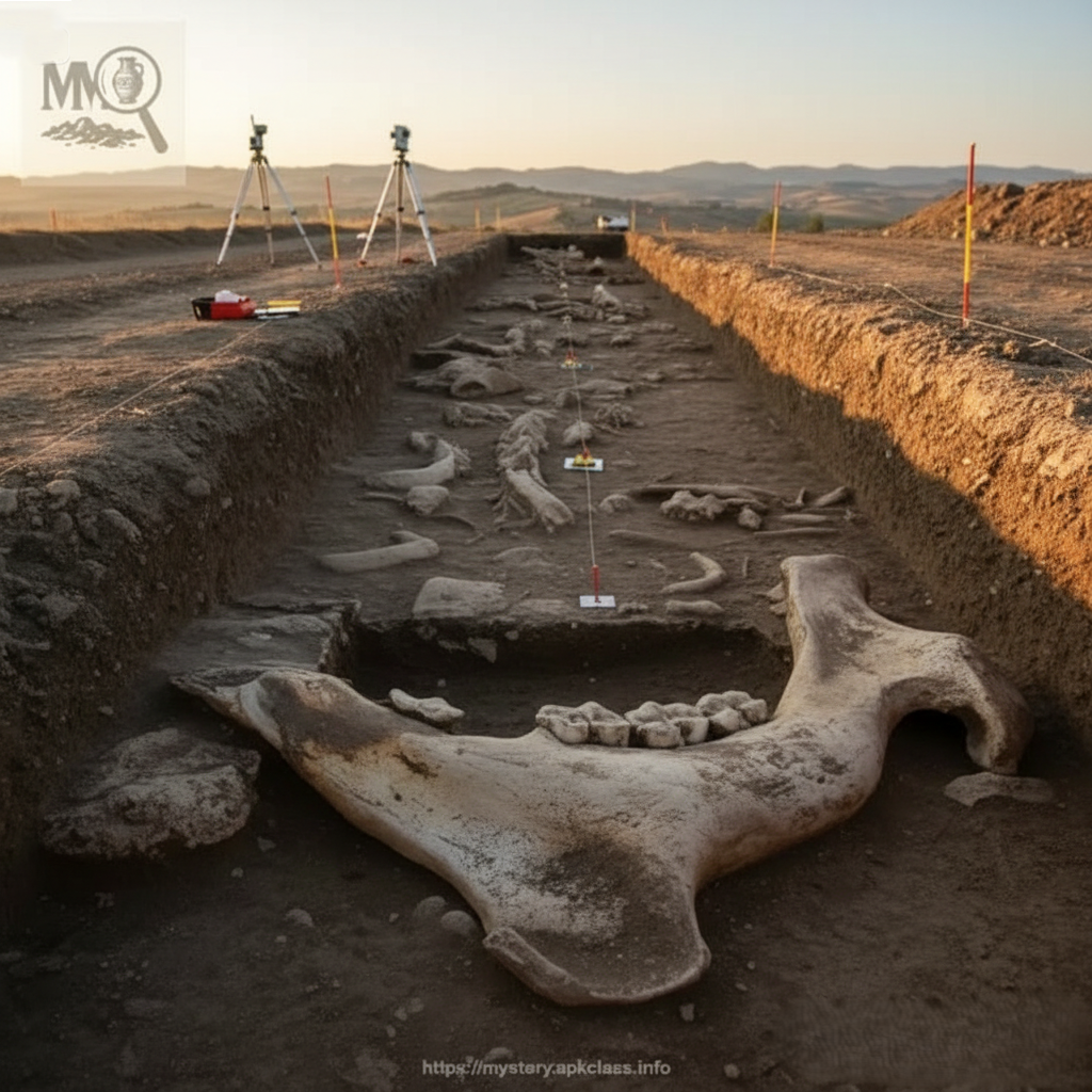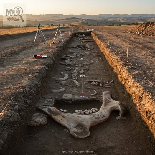 An excavation in the Italian countryside has ignited widespread attention after researchers uncovered what appears to be an enormous jawbone accompanied by a trail of massive skeletal fragments extending across a newly opened trench. The quiet, pastoral landscape provides a stark backdrop to the sheer scale of the remains, prompting intense debate among experts and the public.