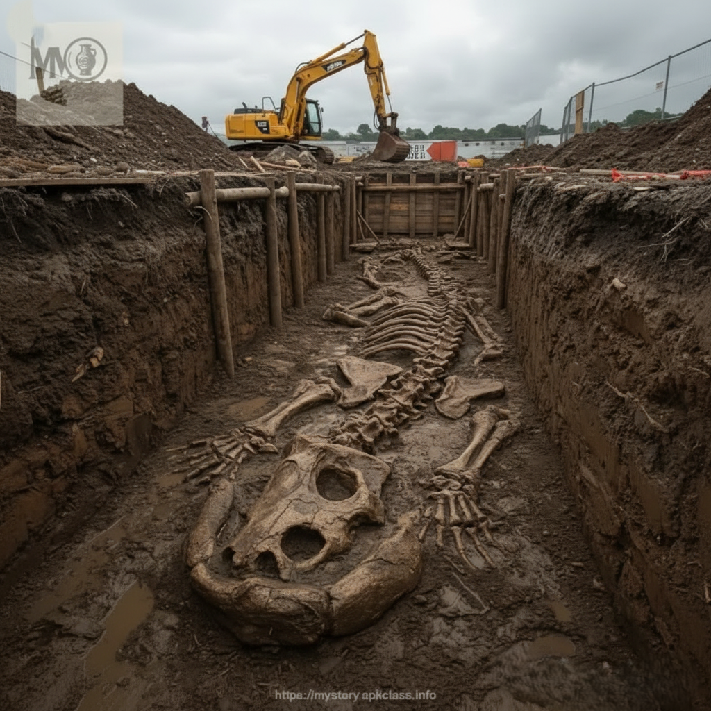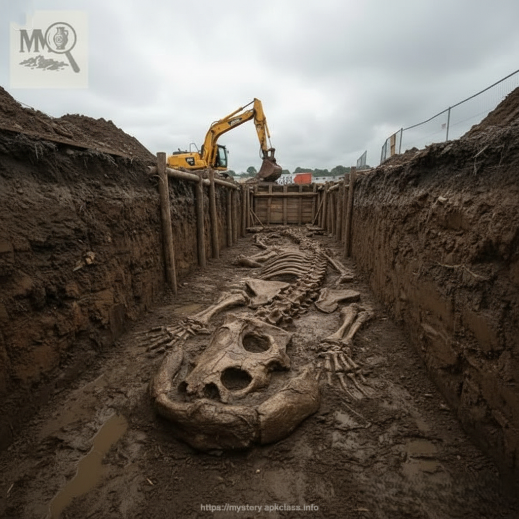 A routine excavation in the United Kingdom has escalated into one of the most widely debated archaeological mysteries of the year. Workers clearing a deep trench in a rain-soaked construction zone stumbled upon what appears to be the massive skeletal remains of an unknown humanoid figure. Within hours, images from the site—showing a towering skull and enormous bone structures emerging from thick layers of mud—spread across social media, triggering a global wave of fascination, skepticism, and intense speculation.
