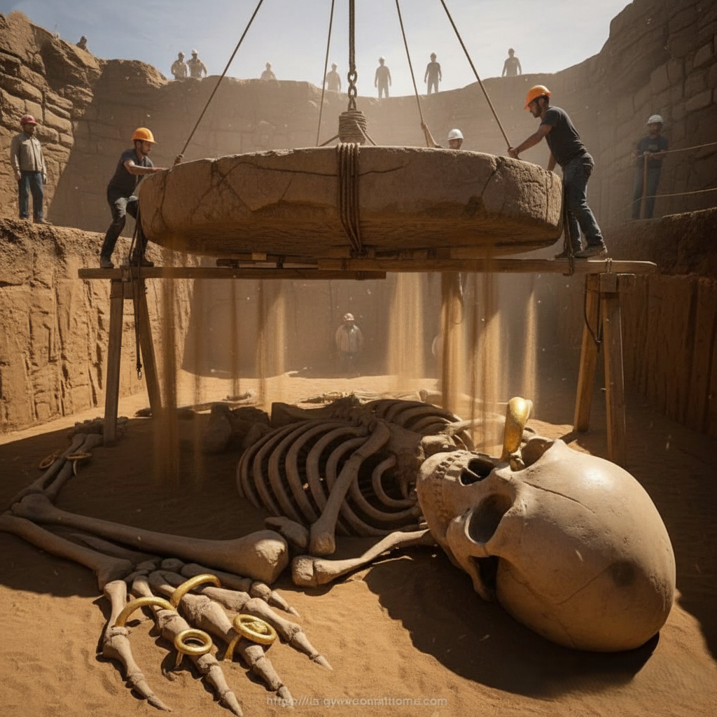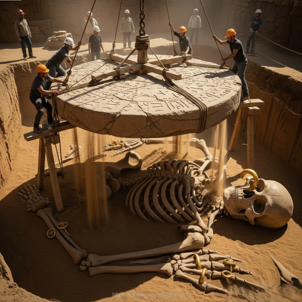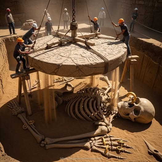 A dramatic archaeological scene has captured global attention after a team of researchers lifted a massive stone seal, revealing what appears to be a colossal skeleton concealed within a sealed underground chamber. As dust settled and the chamber opened for the first time in what may be thousands of years, the scale of the discovery immediately ignited international debate.