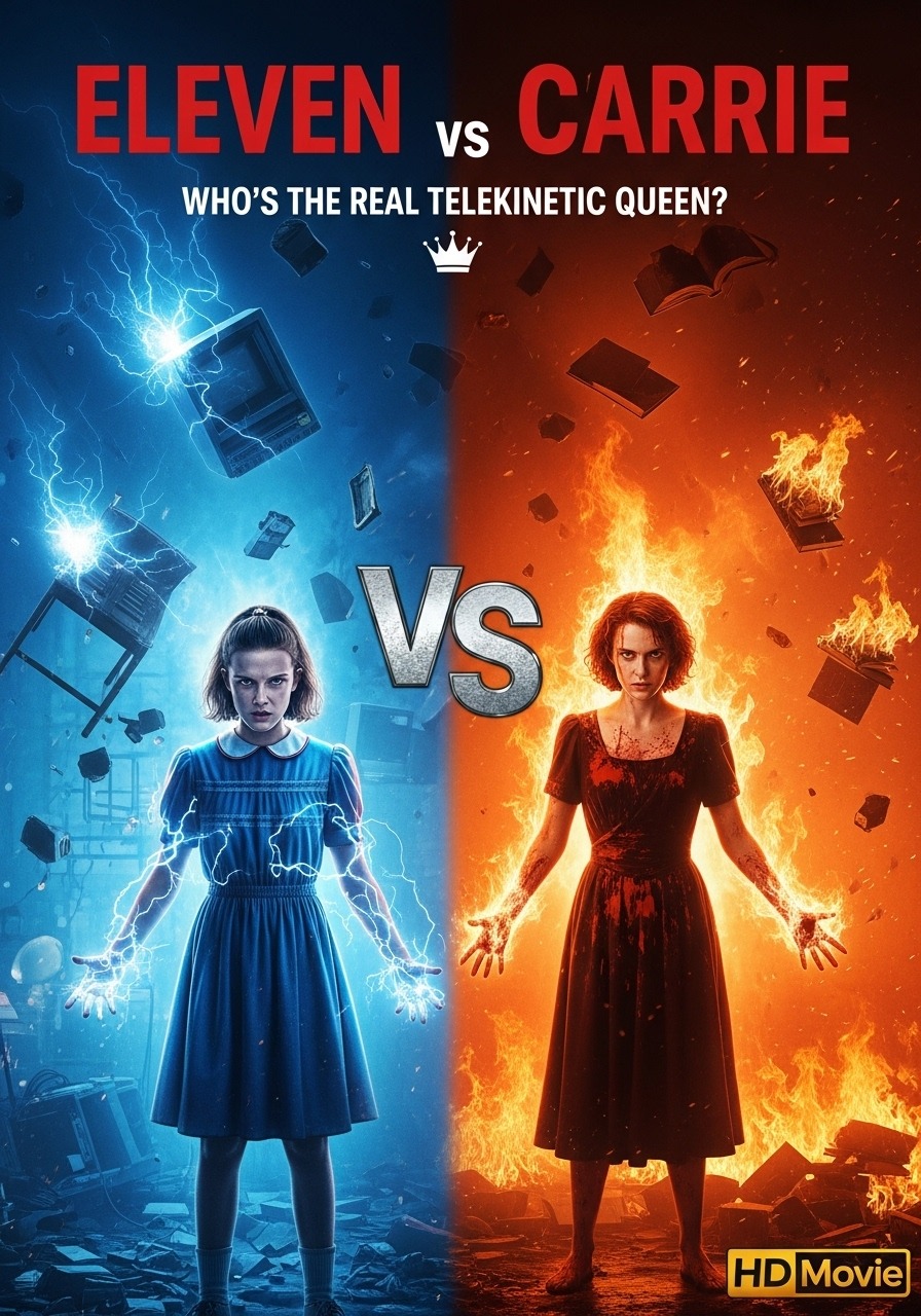 In a chilling clash of supernatural power and human emotions, Eleven vs. Carrie brings together two of the most iconic psychic heroines in horror history. Millie Bobby Brown reprises her role as Eleven, the telekinetic girl who grew up fighting monsters from the Upside Down, now struggles to find balance between her extraordinary abilities and the normal life she craves. Meanwhile, Chloë Grace Moretz embodies Carrie, the tormented teenager whose telekinetic powers erupt with fury when she is pushed beyond her limits.