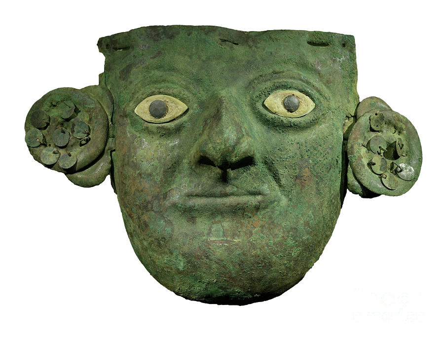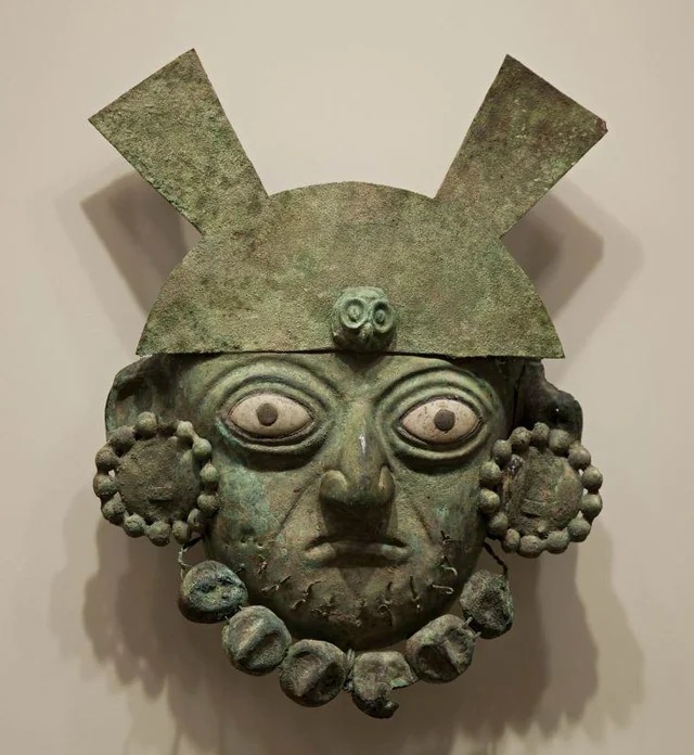 This Moche funerary mask, originating from the Moche Valley in Peru and dating to around 500 AD, was crafted with remarkable skill and symbolic intent.