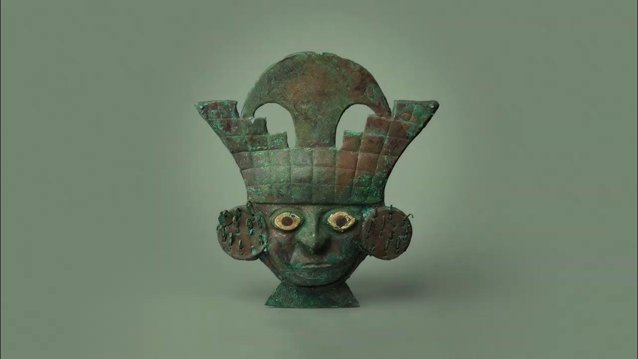 Made from hammered copper, with eyes inlaid using shell and striking purple Spondylus shell pupils, the mask embodies the artistry and ritual complexity of the Moche civilization.