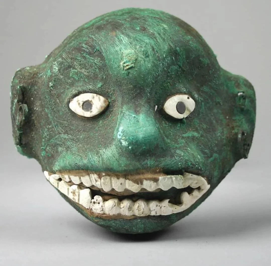 This striking copper funerary mask from the Mochica (Moche) culture of Loma Negra, Piura, Peru dates between 500 BC and 500 AD.