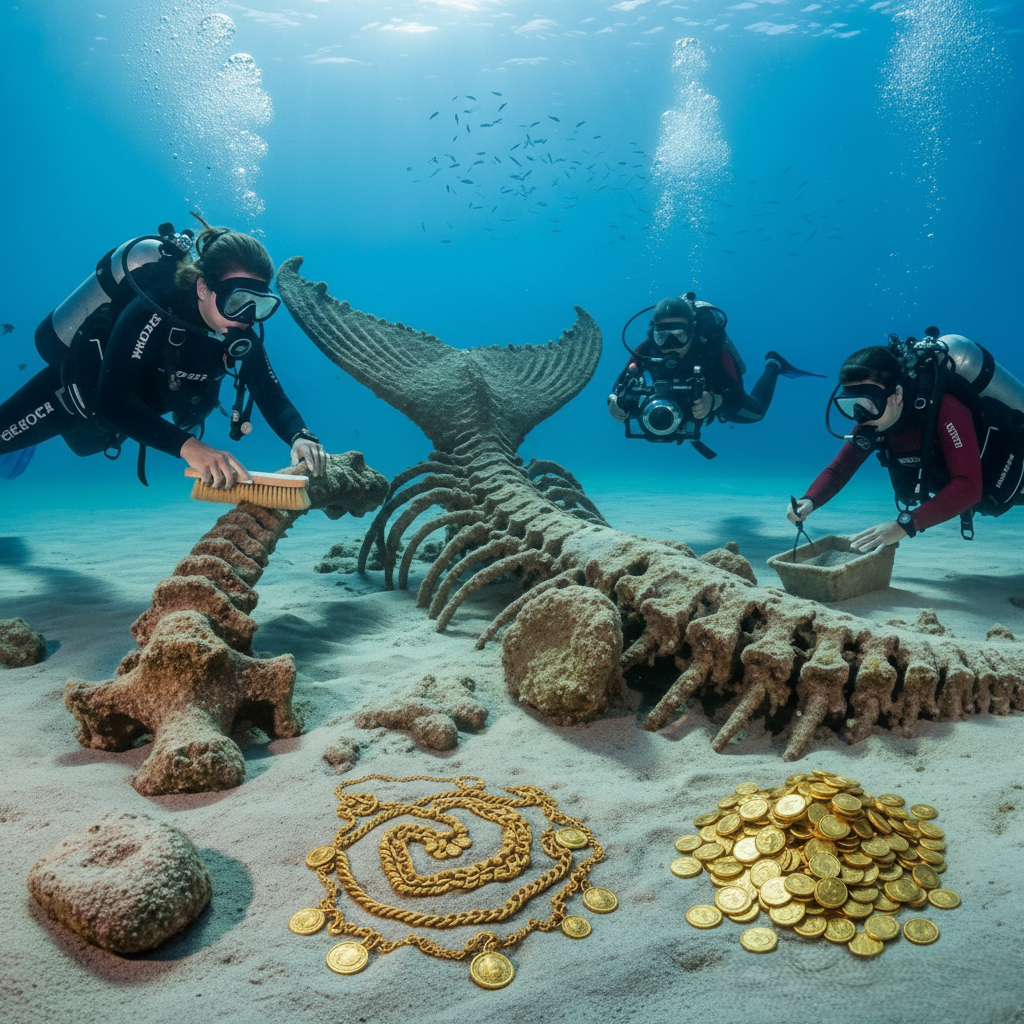 Divers who first recorded the discovery described an immediate sense of awe tempered by caution. The visibility of the site, the untouched positioning of the treasure, and the preservation of the skeletal remains defy the typical chaos of ocean decay. Every detail hints not at accident, but at intention and significance.