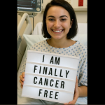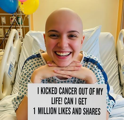 In a bright hospital room—often associated with tears, exhaustion, and fear—a radiant smile suddenly lights up the space. The photo captures a young woman with hopeful eyes, sitting on a hospital bed, hands gently folded under her chin. Her face glows with the joy of victory after a long, exhausting battle. She holds a board that reads: “I kicked cancer out of my life! Can I get 1 million likes and shares?”