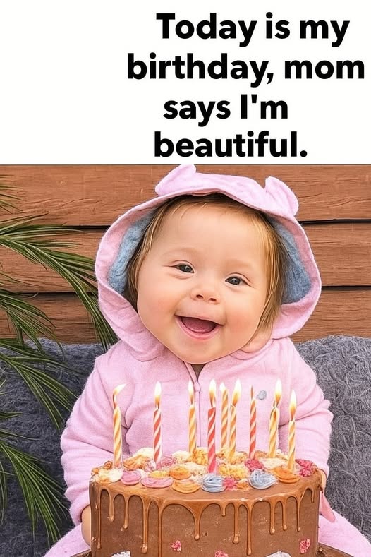Birthdays are always special, but the moment a baby celebrates it in the warmth of family love becomes even more meaningful. In this adorable photo, we see a baby in a soft pink outfit, smiling brightly behind a colorful birthday cake topped with glowing candles. The caption “Today is my birthday, mom says I’m beautiful” feels like a tender message of love, making the moment even more precious.